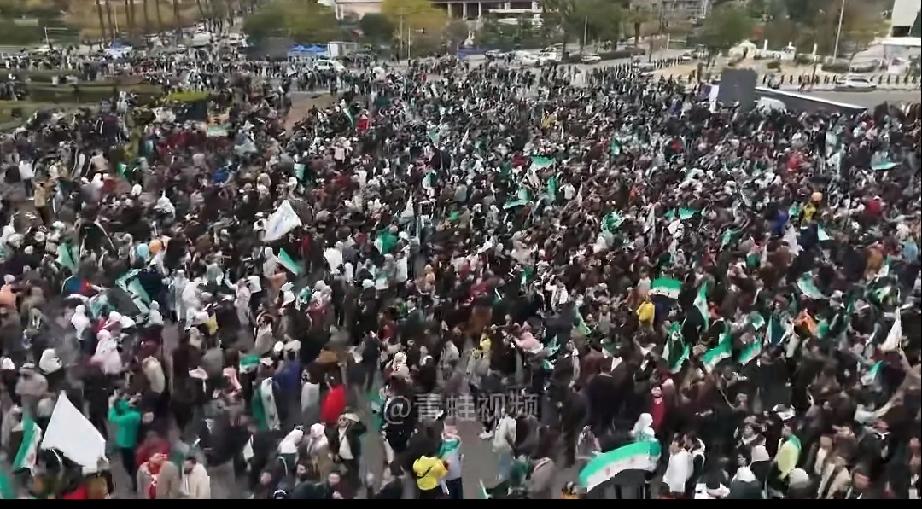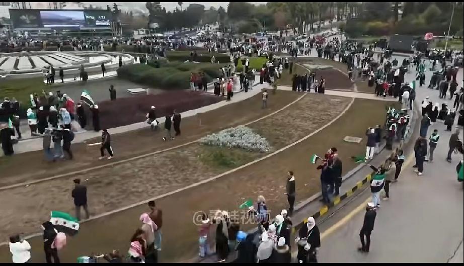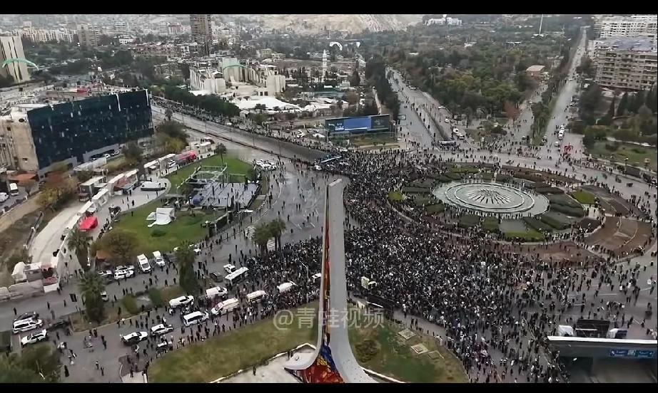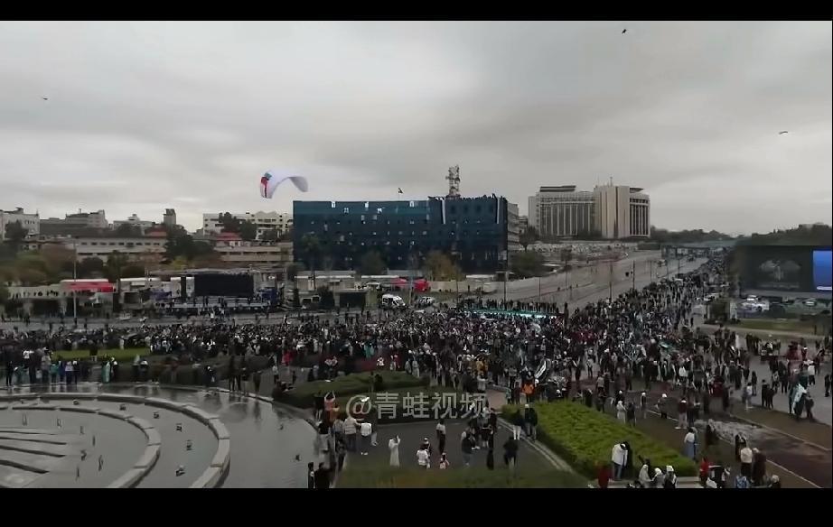 叙利亚群众庆祝阿萨德下台一周年,观看滑翔伞表演。