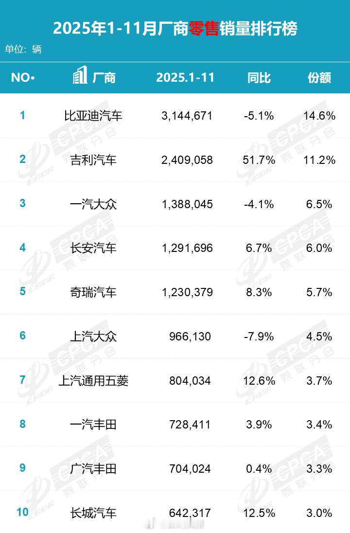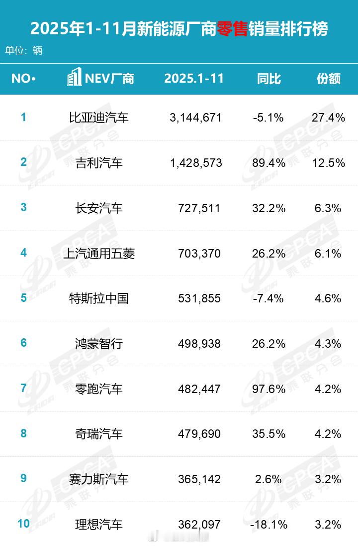 2025年1-11月新能源厂商销量榜发布:理想汽车销量下滑18.1%排名第10位