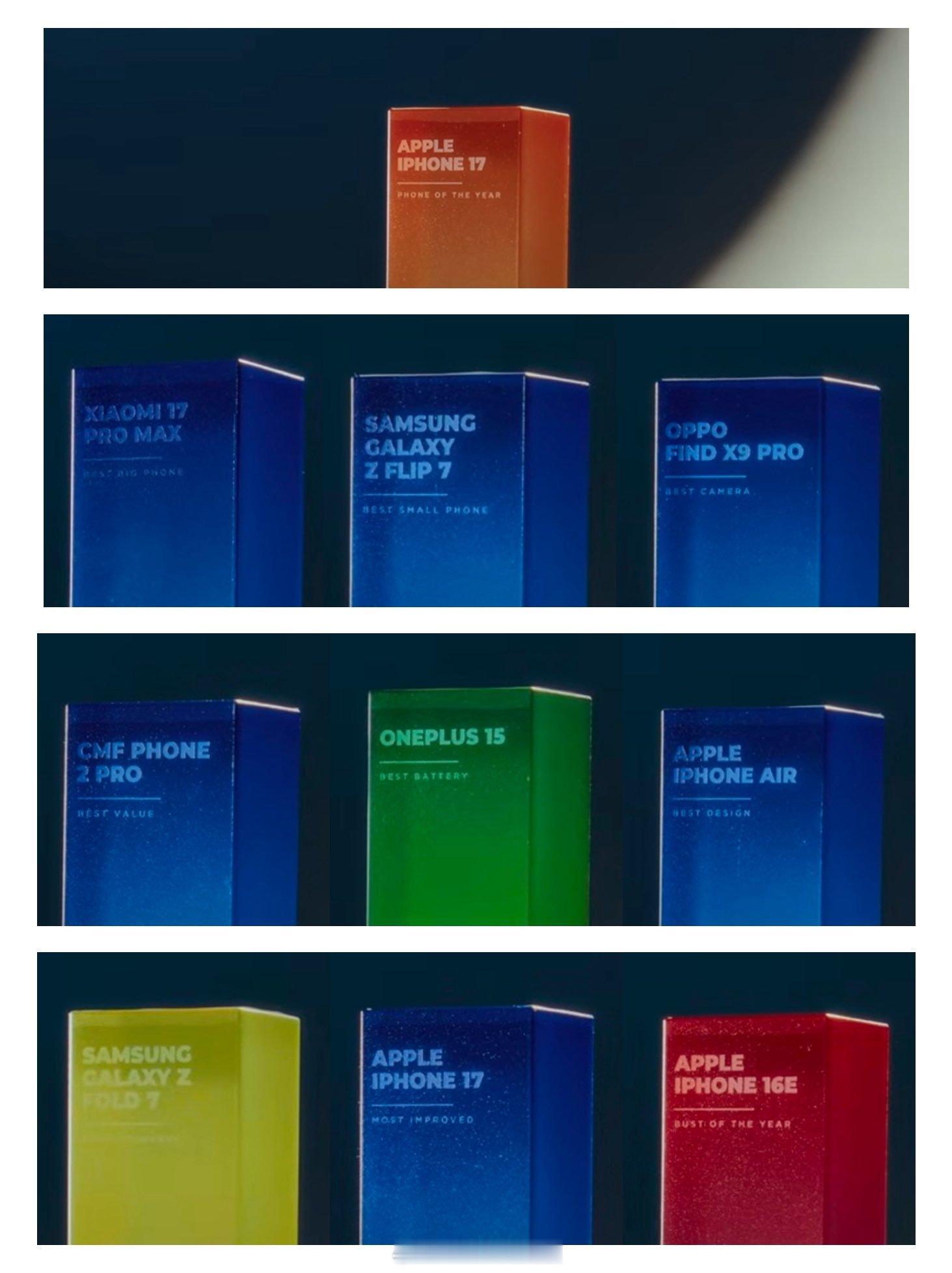 每年的经典保留节目, YouTube 顶流数码博主 MKBHD 把年度最佳手机称号给到了 iPhone 17,iPhone Air 年度最佳设计奖,iPhone 16e 年度最佳败笔奖(这真的是实至名归)。还有三个奖给到了国产手机,OPPO 今年赢麻了:年度最佳拍照手机:OPPO Find X9 Pro 年度最佳续航手机:一加 15 年度最佳大屏手机:小米 17 Pro Max