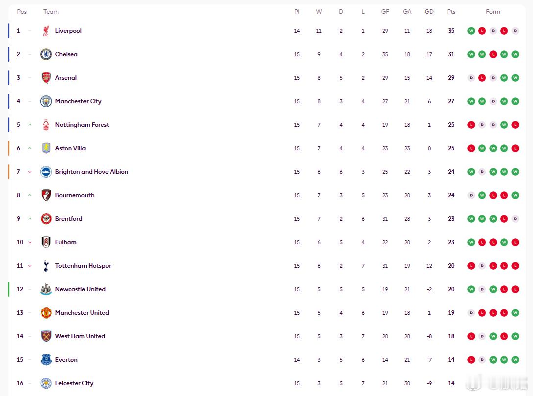 埃弗顿 上赛季15轮战罢,埃弗顿14分排名第15位;本赛季埃弗顿24分,位居积分榜第7位。赛季对赛季对比的话,埃弗顿进步最大,多了10分。就算上赛季那会儿埃弗顿少赛一场,但一直到1月上旬,埃弗顿也才拿了17分,仅仅高出降级区1分,戴奇下课,两天后莫耶斯回归。所以,我们要看到这11个月以来莫耶斯给埃弗顿带来的变化,一支死气沉沉的球队变得活力四射,资质平平的球员依靠团队配合,传切行云流水。恩贾伊在莫耶斯手底下涨球了,新援豪尔、租借来的格拉利什也达到了各自职业生涯的一个新高度。莫耶斯也一直提醒各界保持冷静,马上要接受切尔西、阿森纳两支强队的现实检验了,届时会看到阵容的差距。顺便提一句,利物浦比去年同期15轮战罢,少拿了12个积分。