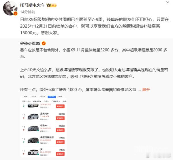 小鹏 X9 超级增程卖爆实锤!副总裁官宣:交付周期延至 7-9 周,25 年 12 月 31 日前锁单享至高 1.5 万购置税补贴!11 月销量破 3200 台,超增版占 2000 + 台,北方卖爆圈粉新用户~硬核 buff:1602km 综合续航 + 10 分钟补 313km,Max 版 750TOPS 算力 + NGP30.98 万起,锁单趁早提车! 小鹏 X9 新能源 MPV