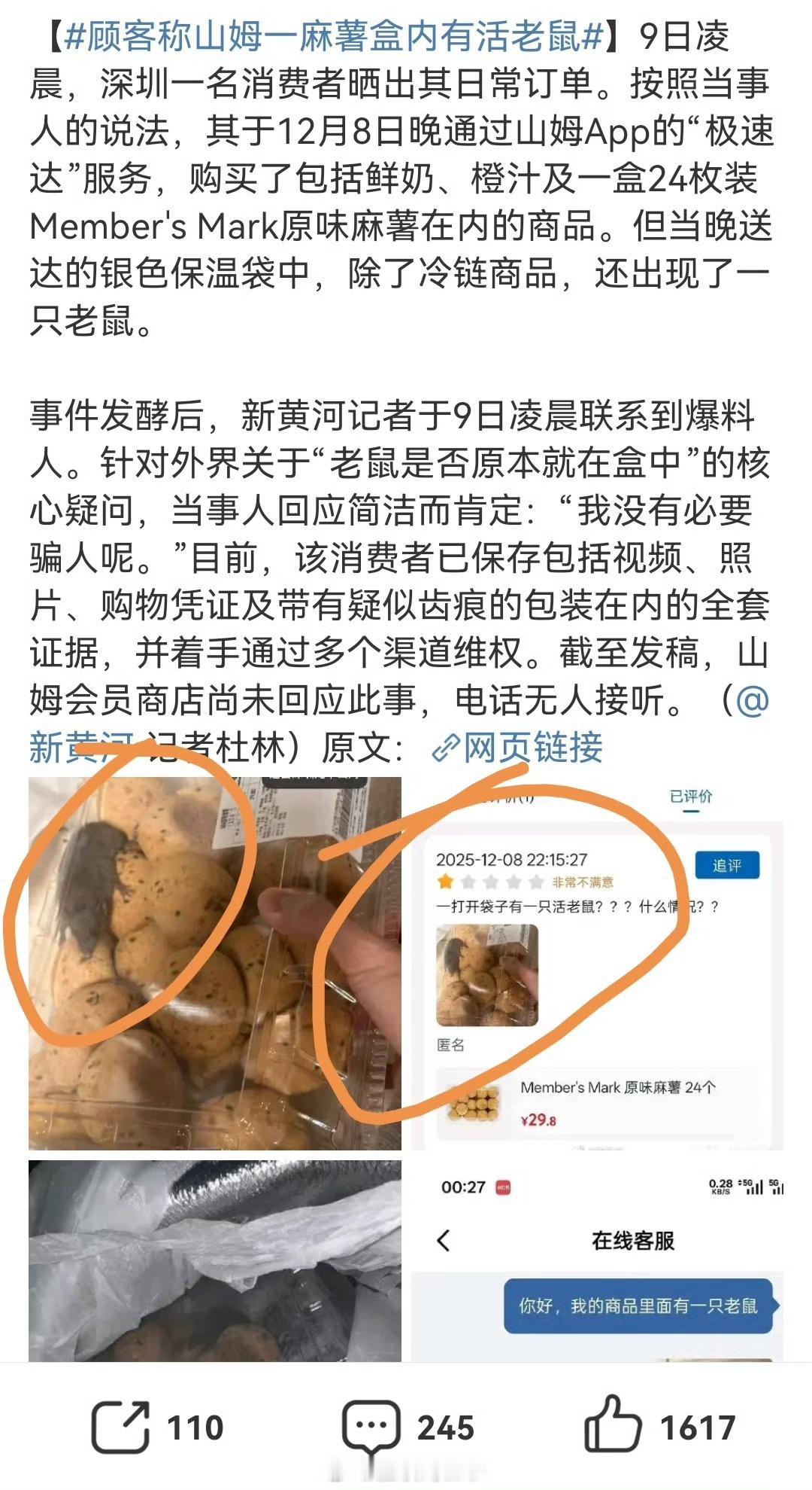 作为高端会员制超市,本应该是大家更愿意花钱买放心的地方,如今却因一只活老鼠引发信任危机! 深圳消费者于12月8日晚通过山姆"极速达"服务收到的麻薯盒内惊现活鼠,部分麻薯表面留有疑似啃食痕迹。 山姆于12月9日发布声明,称经虫害公司全链路核查后判定:生产、仓储、配送环节监控未显示异常,问题源于室外取货点周边花木丛滋生虫害,老鼠在商品放置期间"偶然侵入",承诺加强包装管理与配送服务,并向消费者致歉。 山姆的回复有些牵强了,居然把问题推给了“室外取货点”和“给野生虫害提供了栖息地的花木丛”,这锅甩的漂亮。 问一下山姆,老鼠是怎么能精准撬开密封硬质塑料盒钻进去的?怎么还从里面把盖子扣好的? 就算是老鼠自己钻进去的,但是从生产线到货架,多少双眼睛该检查?硬质透明盒里躺只活老鼠,却能一路绿灯送到顾客手中,这叫偶然? 这叫食品安全全线失守。山姆不能一边收着会员费,一边又用“虫害鉴定”的术语糊弄人,不能让食品安全的责任甩给“花木丛中的虫害们”。 作为高端会员制超市,大家愿意花更多钱,图的就是放心,这次不管是包装问题还是取货点管理漏洞,都得真正整改才行,别光道歉不办事。 希望山姆后续能把包装做得更结实,取货点的防护也做到位,毕竟食品安全真的容不得半点马虎!