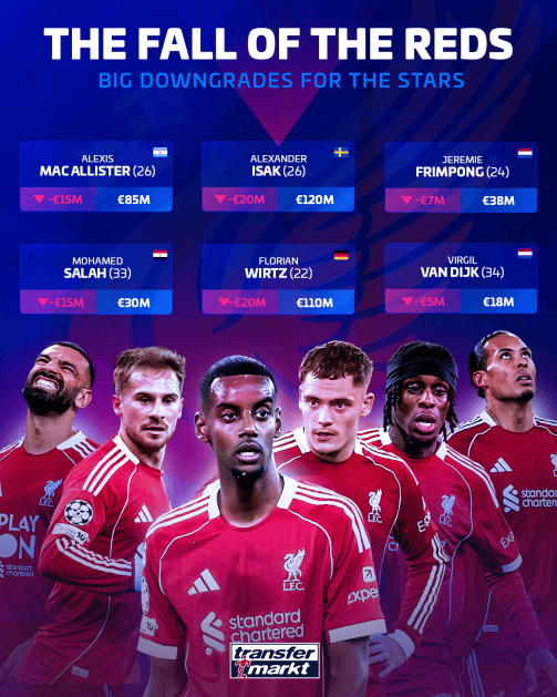 虎扑12月09日讯德国转会市场在今日更新英超球员身价,在球员跌幅方面,利物浦多人下跌