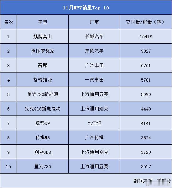 高山这款车悄悄咪咪的已经坐上了MPV的王座了,这种就是纯纯属于闷头搞业绩的典型车型,包括身后的梦想家也稳定前三很久了,那这样看,似乎腾势D9被这两款车抢了不少份额走