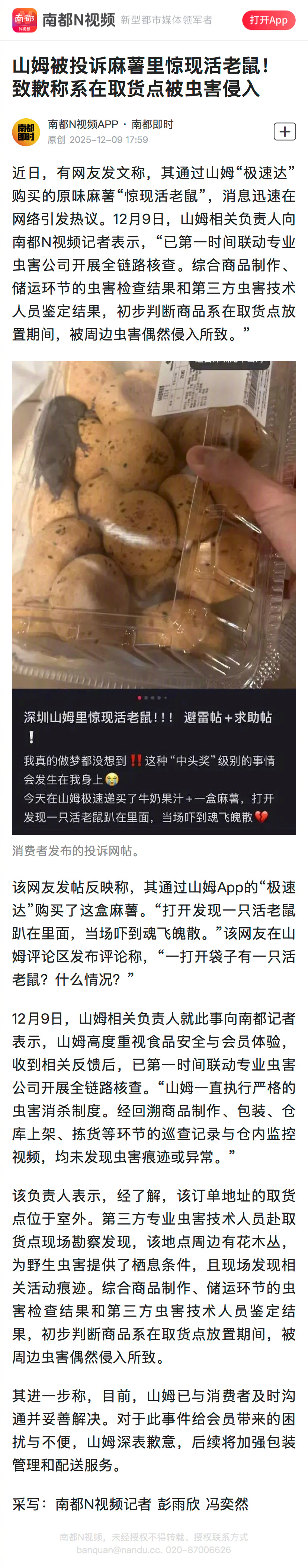 #山姆回应麻薯现活老鼠#【山姆被投诉麻薯里惊现活老鼠!致歉称系在取货点被虫害侵入】#山姆称商品在取货点遭虫害侵入#近日,有网友发文称,其通过山姆“极速达”购买的原味麻薯“惊现活老鼠”,消息迅速在网络引发热议。12月9日,山姆相关负责人向南都N视频记者表示,“已第一时间联动专业虫害公司开展全链路核查。综合商品制作、储运环节的虫害检查结果和第三方虫害技术人员鉴定结果,初步判断商品系在取货点放置期间,被周边虫害偶然侵入所致。”南都N视频记者 彭雨欣 冯奕然#山姆致歉#