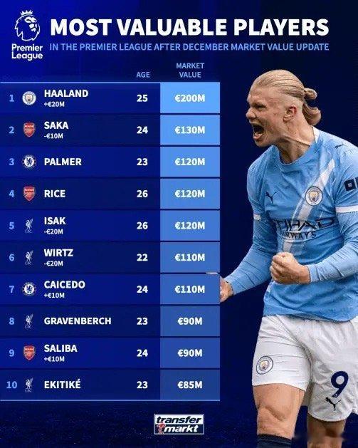 德转更新了英超球员的身价👇哈兰德身价重回2亿萨拉赫身价跌至3000万欧热点解读 伊萨克和维尔茨身价各下跌了2000W