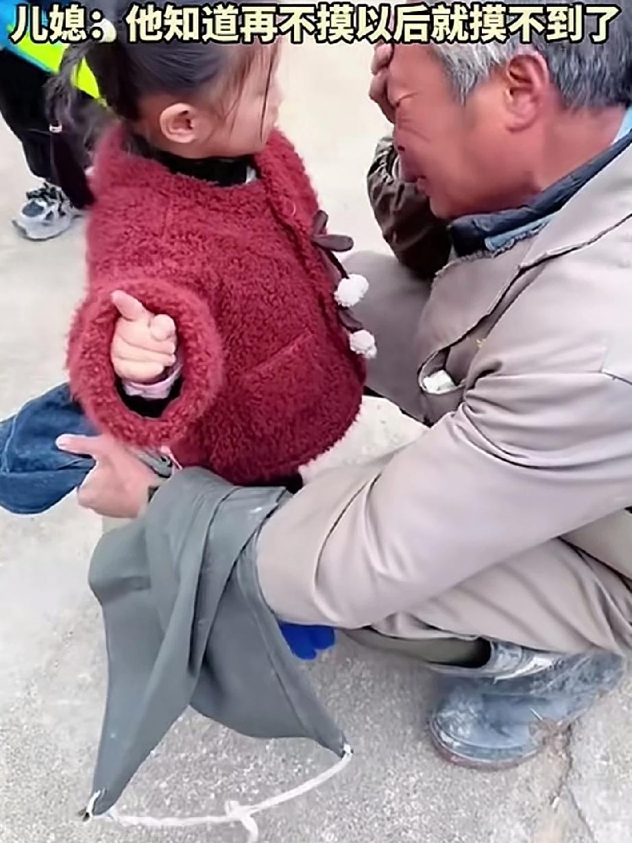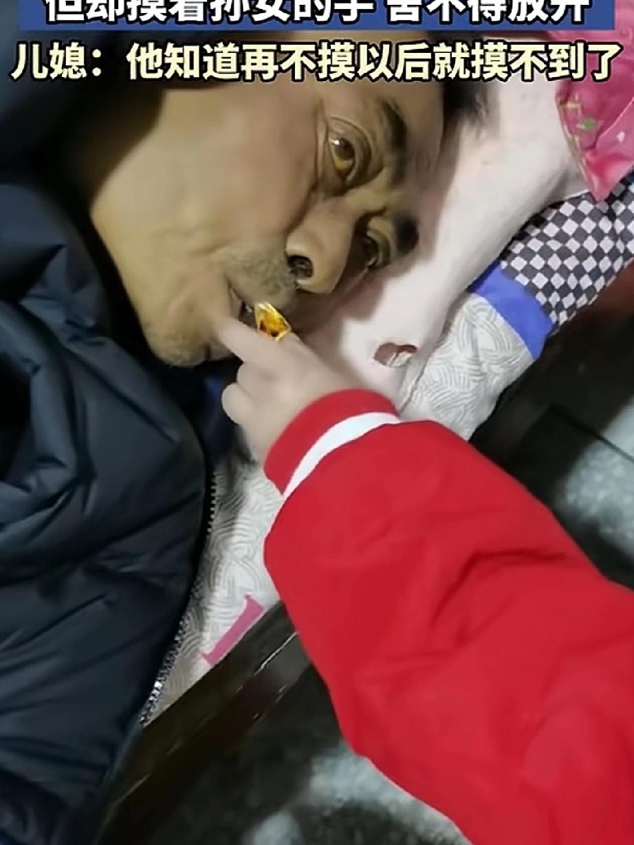 一年前爷爷抱着回家的孙女爱不释手,可爷爷抱着抱着哭了,这个时候他已经知道自己的生命,已进入倒计时,怕以后再无力气抱起孙女,他的心情低落至冰点! 一年后爷爷果真病倒入院,躺在病床上,再次见到孙女,想抱,可心有余而力不足!只能用手摸着孙女的头,久久不舍得放手,怕一撒手就是永远,爷爷倍加珍惜与孙女在一起的分分秒秒,隔辈亲,刻在骨子里的感情,时间慢些再慢些,让爷爷多陪陪孙女,直到生命的尽头吧!