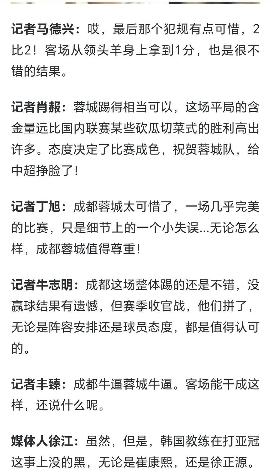 热议成都蓉城2-2战平神户胜利船,结果有遗憾,但是蓉城真拼了。 年度收官战,成都蓉城还是派出了全主力阵容,最后一个争议点球让蓉城3分变1分。要知道这是客场对阵神户胜利船,面对东亚区第一,蓉城踢的比较硬朗。正如徐江所说:韩国人打亚冠没得黑,无论崔康熙,还是徐正源。 而有的球队,明明有实力,却在亚冠一直是替补,半主力出战,态度出现的问题,足球界和球迷眼睛是雪亮的。 成都蓉城 成都蓉城队
