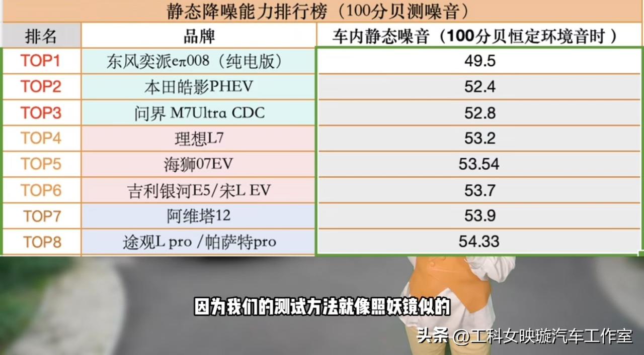 懂车帝测评噪音,迈巴赫不如20-30万的电车,真的有可能是真的,之前,我们用相同的测试方法,外部环境音恒定(100分贝),测试车内外噪音差值,我们叫《100分贝测噪音》,测过奥迪A8L对比腾势Z9,A8L的成绩真的让人怀疑人生。越超豪华的车,越显出堆料的厚道。汽场全开 去年这个时候,我们发布过36款车的静态噪音和动态噪音排行榜单,再发出来让大家看看。