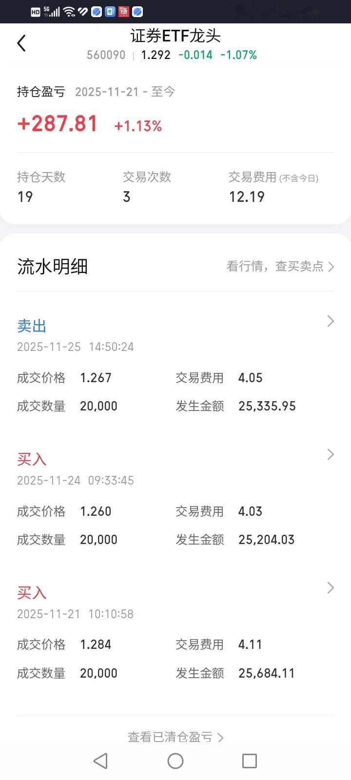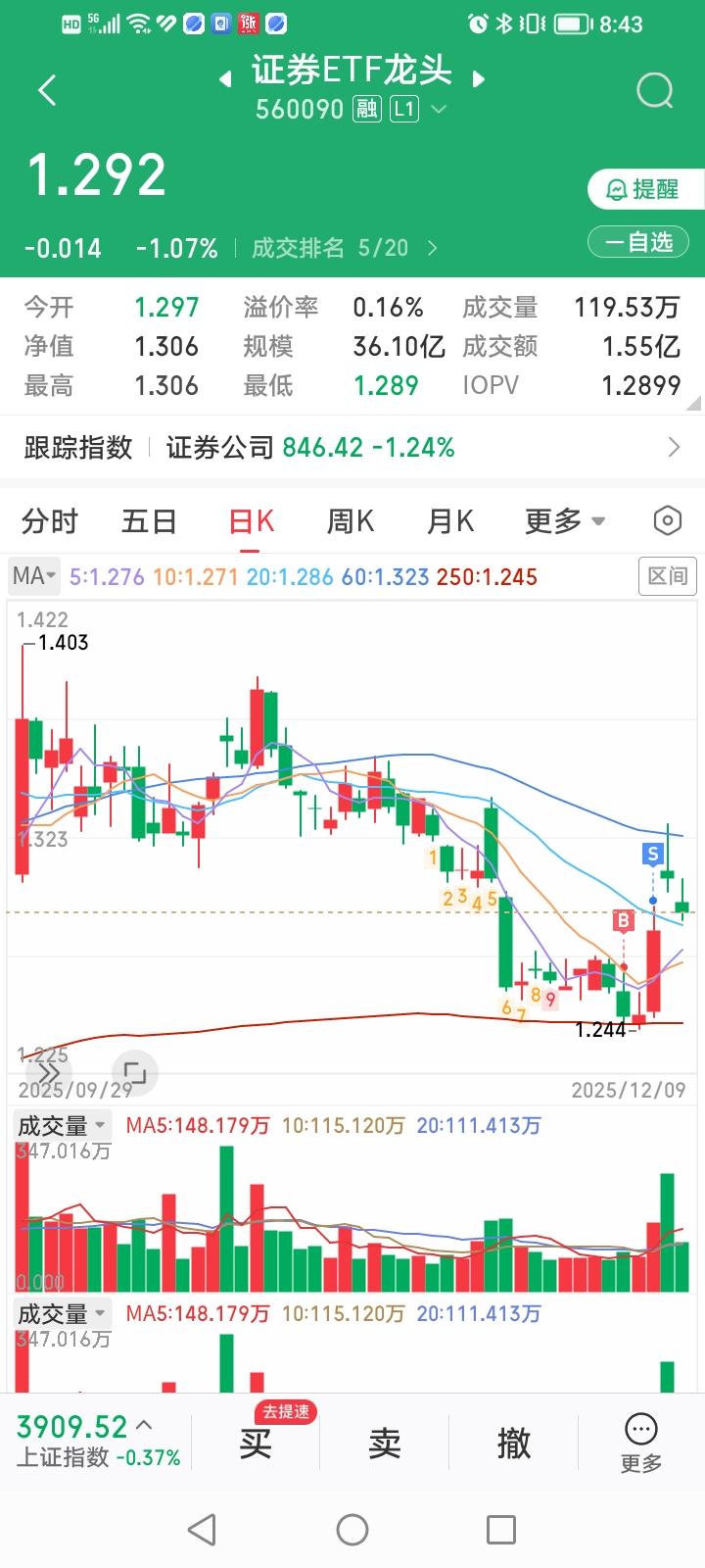 真是逢缺必补啊!证券ETF龙头昨天高开高走,一高开咱就有点怕,就挂了个卖单想卖点,结果挂价太高没卖出去。 结果今天证券ETF龙头立马给你好看,今天收盘下跌1.04%,真的补完了缺口。 感觉玩券商股不如玩这个证券ETF龙头好,不担心踩雷,还没有印花税,佣金还可以万一免五。 如果明天再跌,似乎可以加仓了。