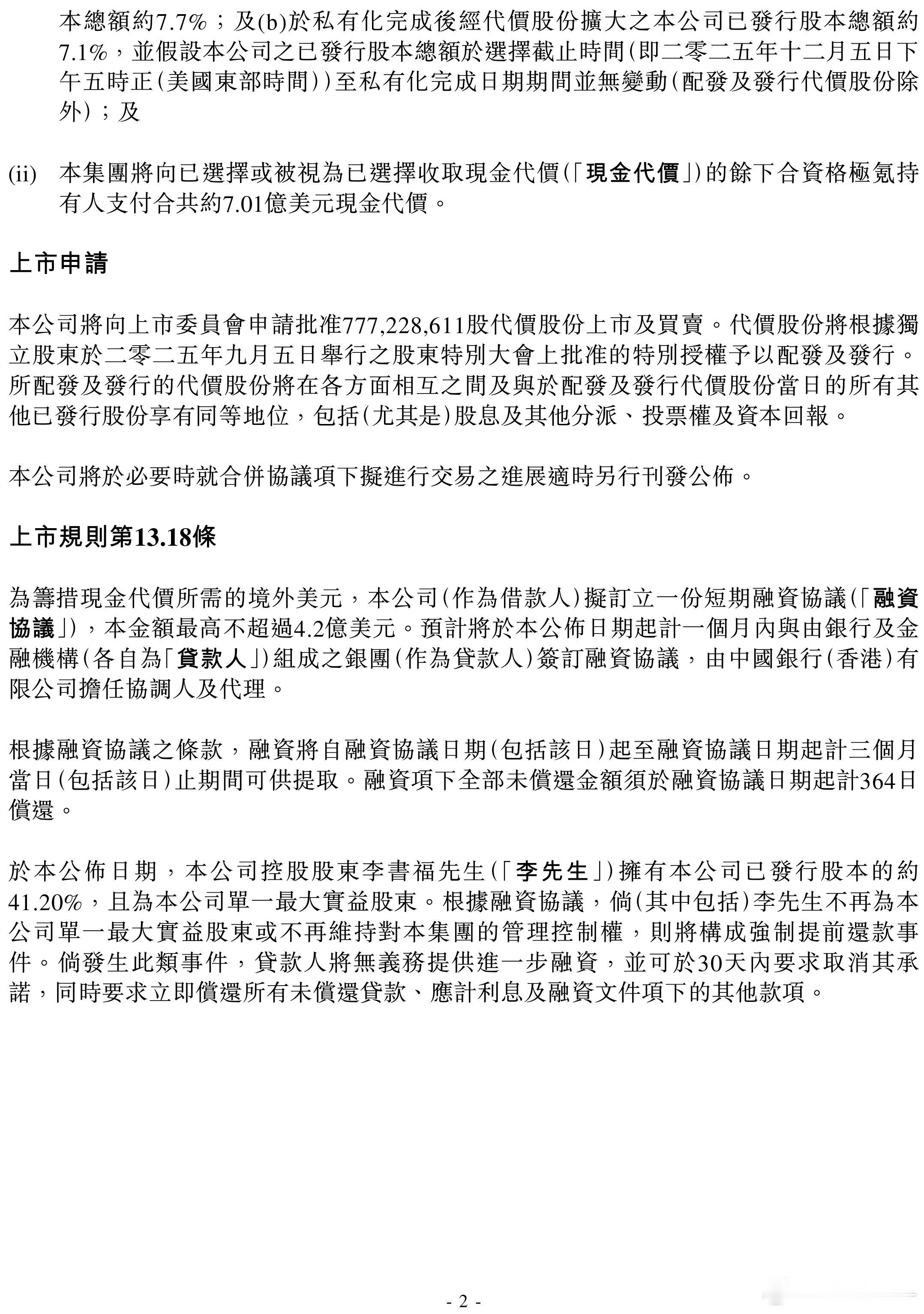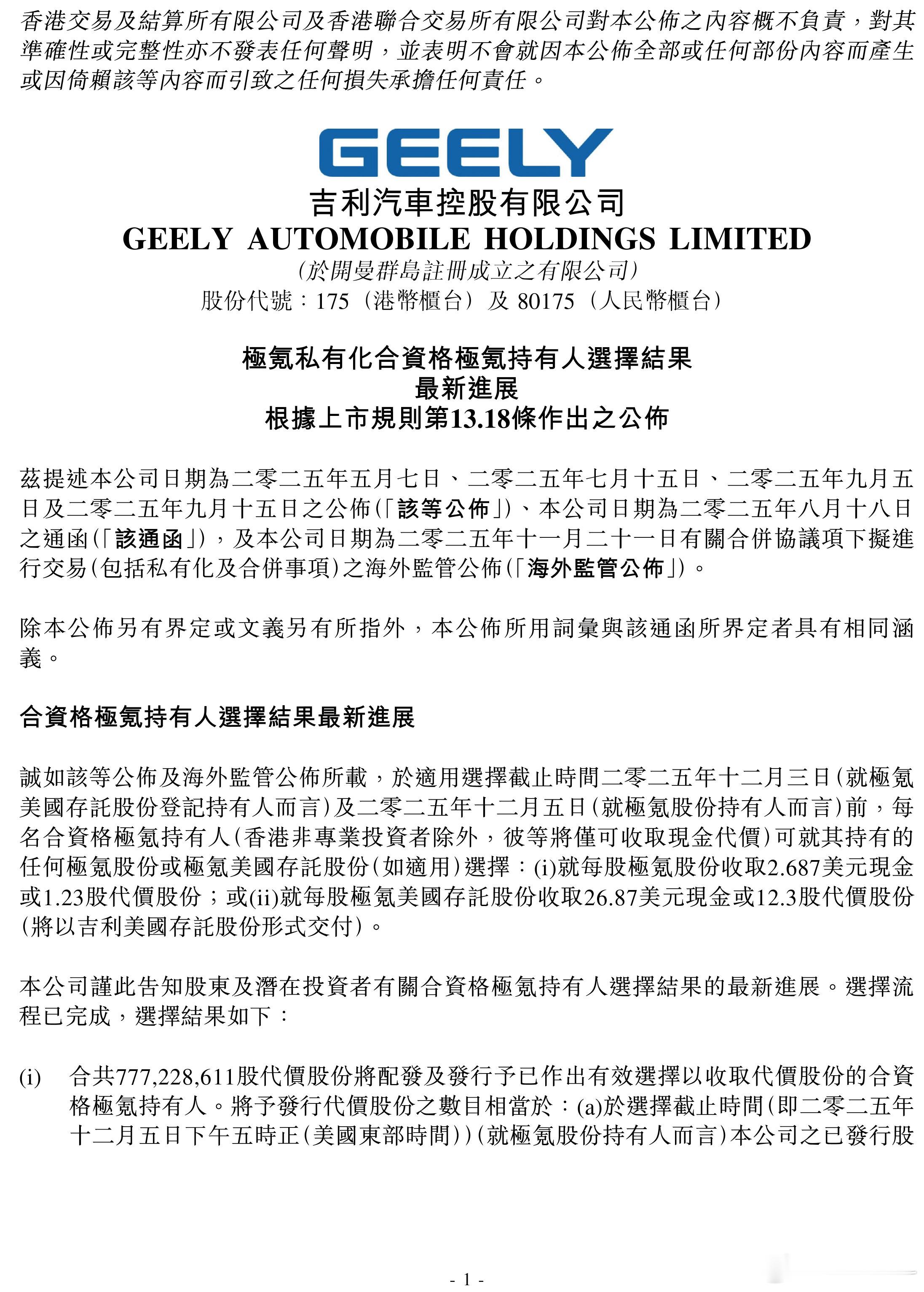 吉利汽车私有化极氪的交易已进入最后阶段根据吉利汽车于今日发布的公告,极氪私有化交易的持有人对价选择结果已确定:约70.8%的合资格极氪持有人选择以股份作为对价,吉利汽车将配发及发行约7.77亿股代价股份;约29.2%的持有人选择或被视为选择现金对价,吉利汽车将支付合计约7.01亿美元现金。极氪吉利汽车