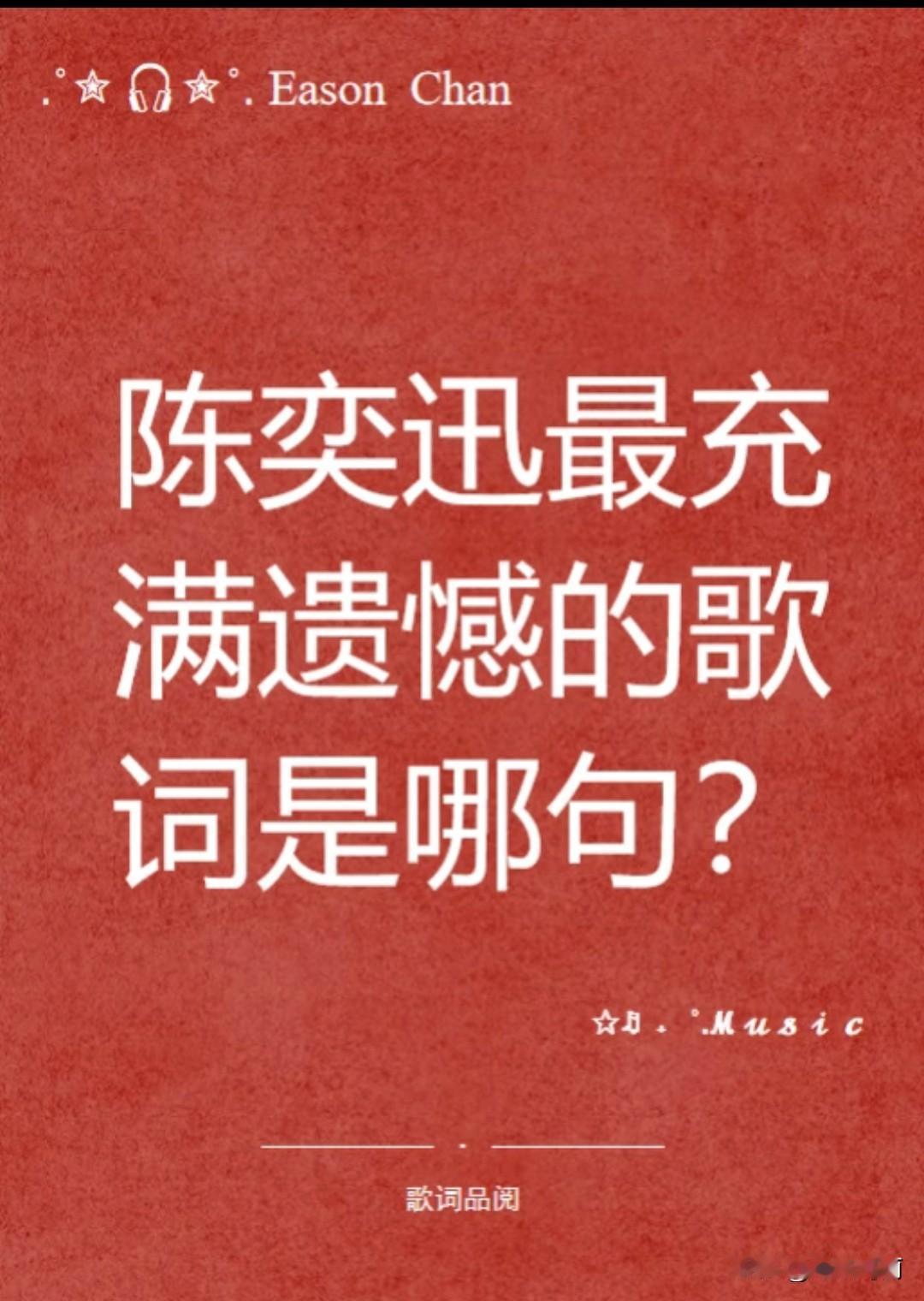 你选择陈奕迅 哪句歌词表达遗憾伤心 01 "缠在我颈背后,最美丽长发未留在我手,我也开心饮过酒。" ——《人来人往》 02 "总差一点点先可以再会面,悔不当初轻轻放过,现在惩罚我分手分错了么。"——《十面埋伏》 03 "谁能凭爱意让富士山私有。"——《富士山下》 04 "离开你六十年,但愿能认得出你的子女,临别亦听得到你讲再见。"——《明年今日》 05 "你可知我背后,有几多眼泪朝着你流"——《孤独探戈》 06 "迟两秒搭上地下铁,能与你碰上么?如提前十步入电梯,谁又被错过。"——《十面埋伏》 07 "你的背包对我沉重的审判,借了东西为什么不还。"——《你的背包》 08 "直到和你做了多年朋友,才明白我的眼泪不是为你而流,也为别人而流。"——《十年》 09 "得不到的永远在骚动,被偏爱的都有恃无恐。"——《红玫瑰》 10 "你不要失望,荡气回肠是为了最美的平凡。"——《爱情转移》 11 "我已经相信有些人我永远不必等,所以我明白在灯火阑珊处为什么会哭。"——《K歌之王(国语)》 12 "为何旧知己,在最后,变不到老友。" ——《最佳损友》 13 "我最大的遗憾,是你的遗憾与我有关。" ——《我们》 14 "我的请帖是你的喜帖,你要的一切,如今都变成我的心碎。" ——《婚礼的祝福》 15 "来年陌生的,是昨日最亲的某某。" ———《最佳损友》 16 "命运敲定了,要这么发生,讲分开可否不再用憾事的口吻,习惯无常才会庆幸,讲真天涯途上谁是客散席时 怎么分" ——《落花流水》 17 "铃声可以宁静,难过却必不过,如果沉默太沉重,别要轻轻,带过" ——《Shall we talk》 18 "月亮总不肯照亮情欲深处那道背影,你我像快快乐乐同游在异境,浪漫到一起惹绝症 " ——《无人之境》
