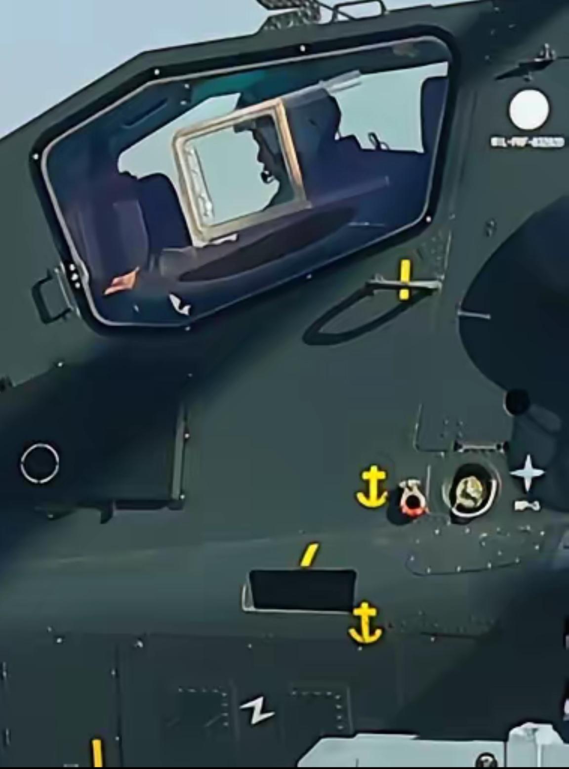 武直十武装直升机侧面照一角。 这种像船上的铁锚样的黄色标识符号是干啥的呢? 直-10武装直升机侧面喷的黄色“铁锚”形标志,是机务保障质量等级徽章,俗称“锚徽”或“机务徽”。 飞机大修或中修后,一次性通过全部质量验收的直升机,在机身左侧喷上这种标志,代表“可执行战斗任务”的最高等级。 锚体象征牢固、可靠,翅膀象征飞行,合起来表示“机务保障可靠、飞机状态良好、随时可以升空作战”。