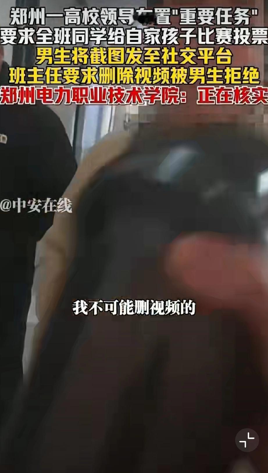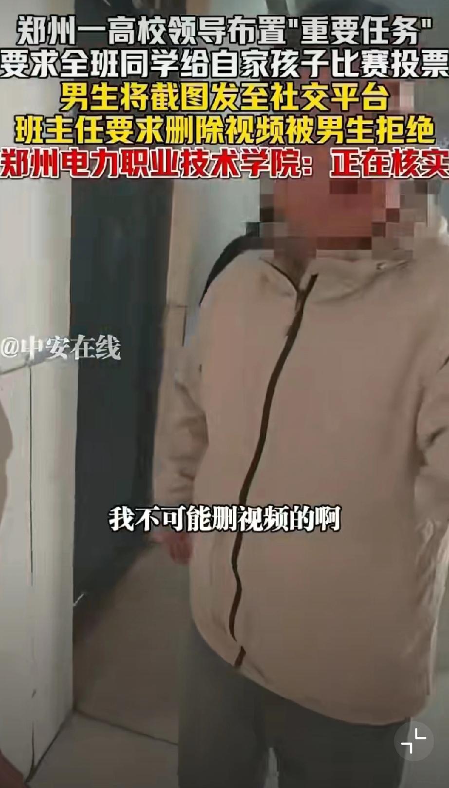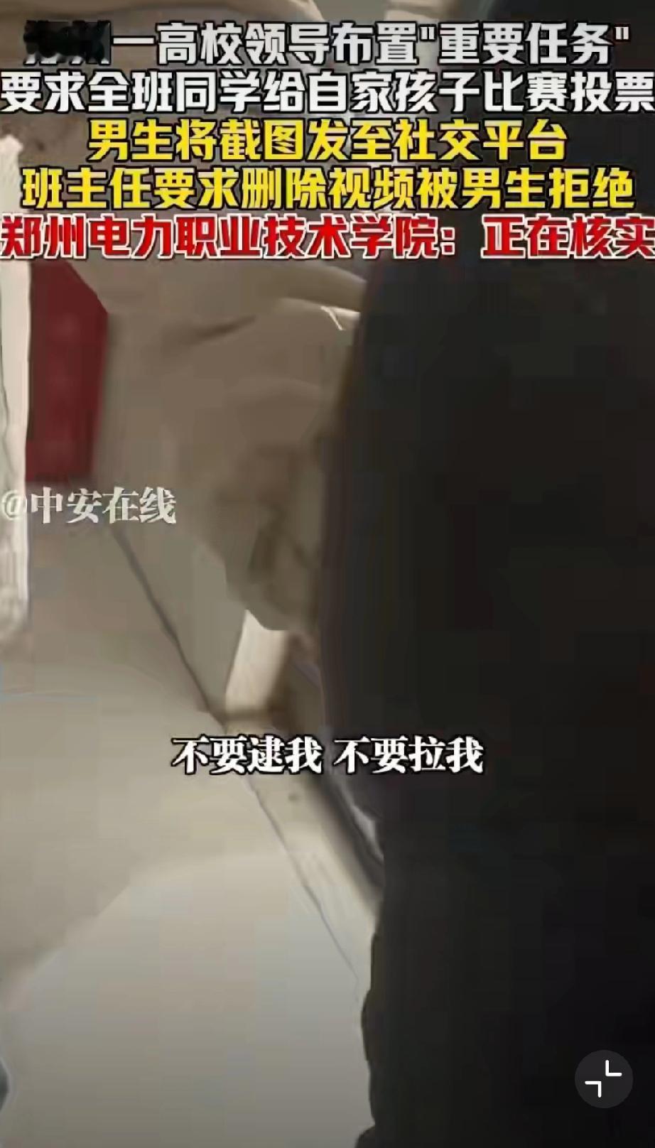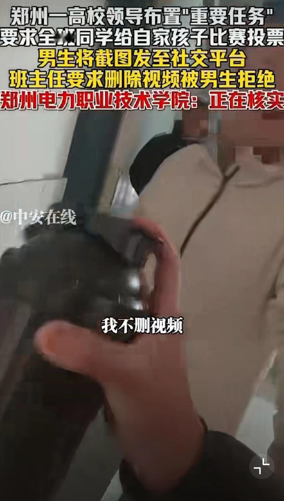 高校被曝让学生给领导孩子投票,学生:领导让学生会部门发通知,强制要求学生给参加歌手大赛的领导孩子投票。学生发社交平台曝光,随后曝出班主任要求删帖。郑州电力职业技术学院一学生称,该通知是在学生会内发布,要求通知给学生,班主任未在班级群内说过此事。 当地:正在核查。 郑州身边事 大学生网络投票