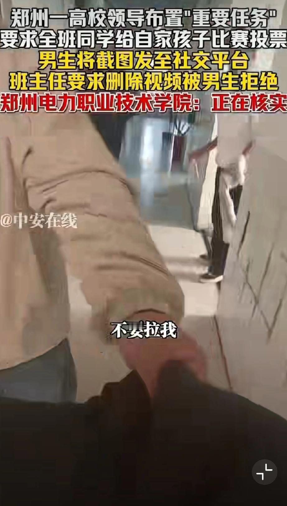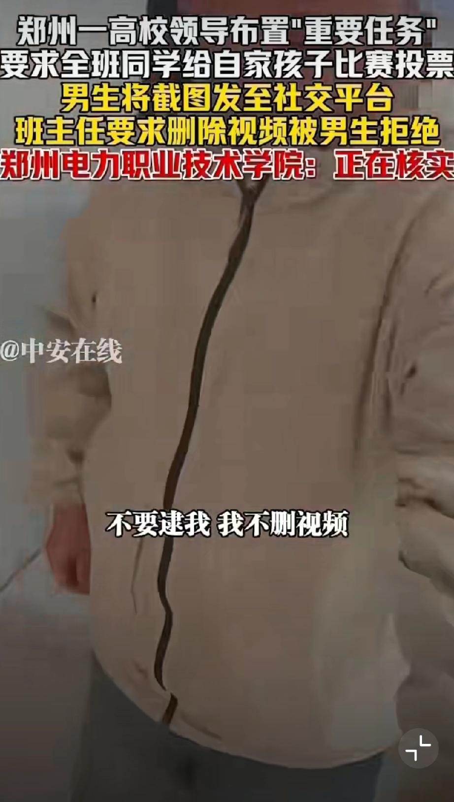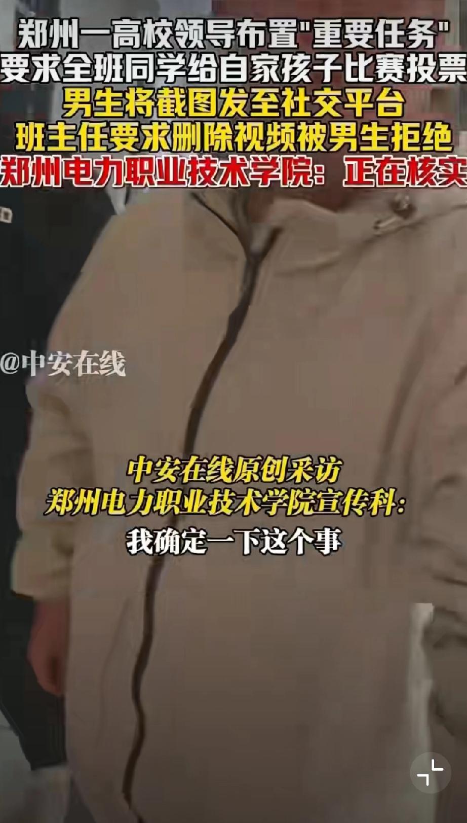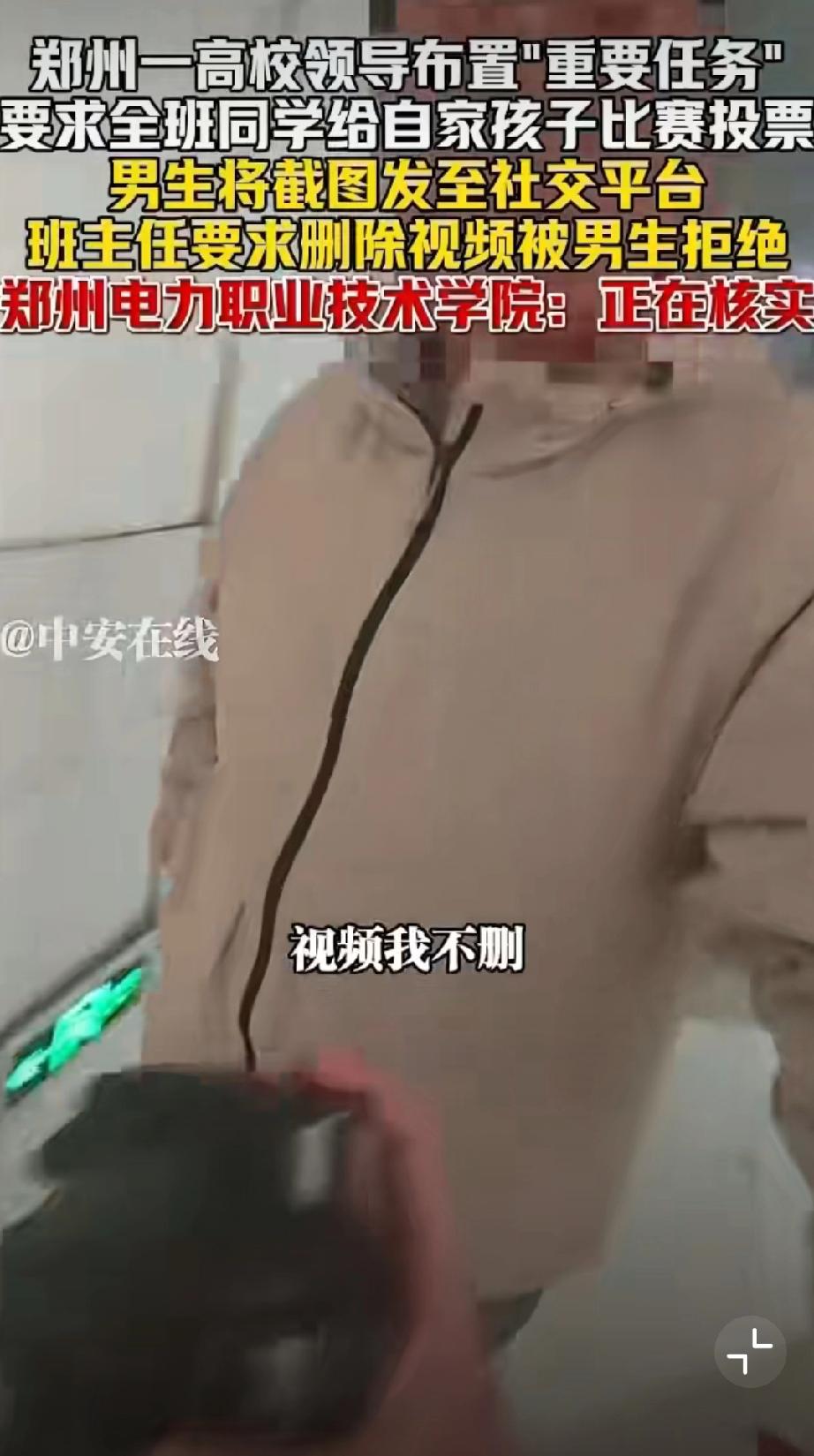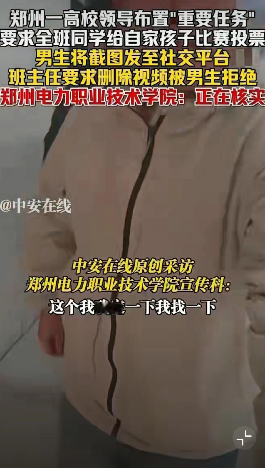 高校被曝让学生给领导孩子投票,学生:领导让学生会部门发通知,强制要求学生给参加歌手大赛的领导孩子投票。学生发社交平台曝光,随后曝出班主任要求删帖。郑州电力职业技术学院一学生称,该通知是在学生会内发布,要求通知给学生,班主任未在班级群内说过此事。 当地:正在核查。 郑州身边事 大学生网络投票