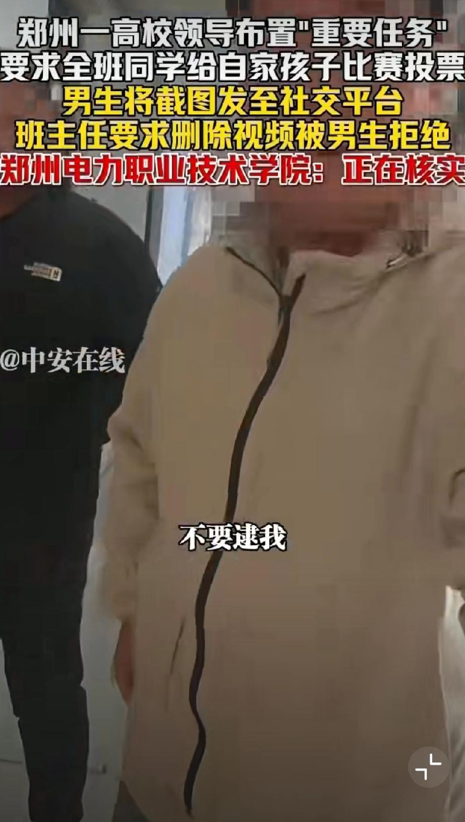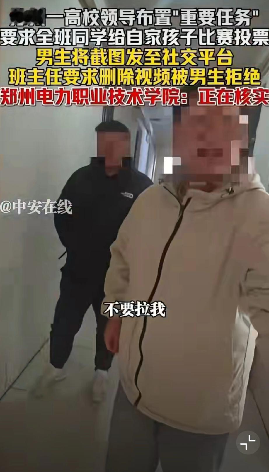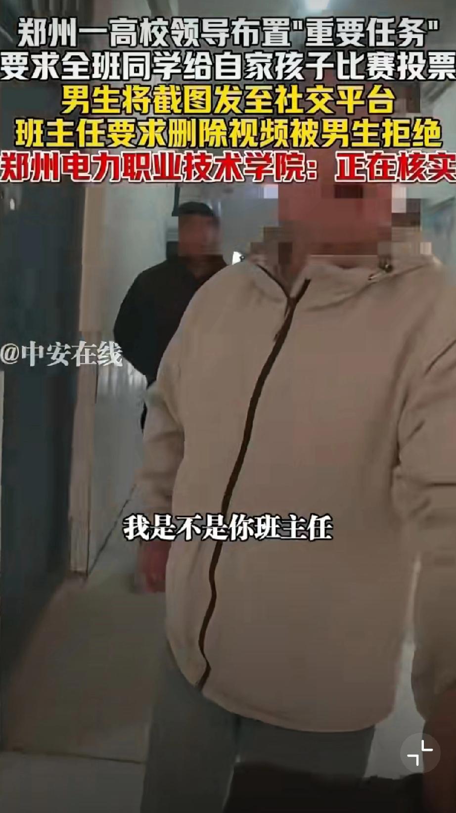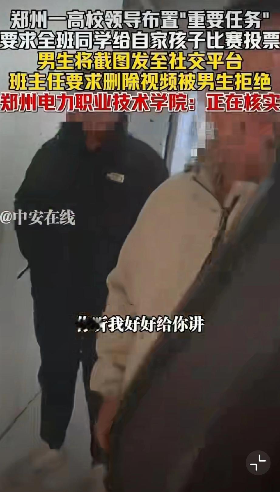 高校被曝让学生给领导孩子投票,学生:领导让学生会部门发通知,强制要求学生给参加歌手大赛的领导孩子投票。学生发社交平台曝光,随后曝出班主任要求删帖。郑州电力职业技术学院一学生称,该通知是在学生会内发布,要求通知给学生,班主任未在班级群内说过此事。 当地:正在核查。 郑州身边事 大学生网络投票