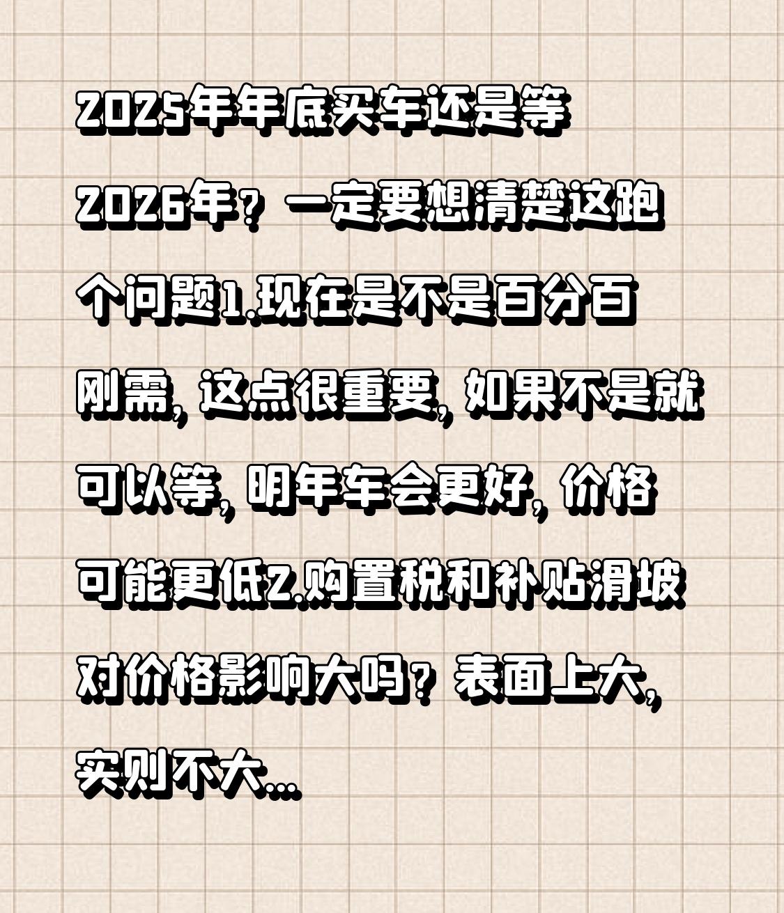 2025年年底买车还是等2026年?一定要想清楚这跑个问题! 1.现在是不是百分百刚需,这点很重要,如果不是就可以等,明年车会更好,价格可能更低 2.购置税和补贴滑坡对价格影响大吗?表面上大,实则不大,价格上涨购车成本上升,需求减少,车价必然降价来应对产能过剩,所以不必慌 3.明年后年,价格可能上升,但是车子会越来越有料,有性价比,比如过去同样的价格,给你更大电池,更新技术,更高的配置。 所以刚需者早买早享受,等等党永不吃亏!买车的意义 买车原则 关注我,买车路上不踩坑!