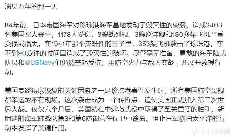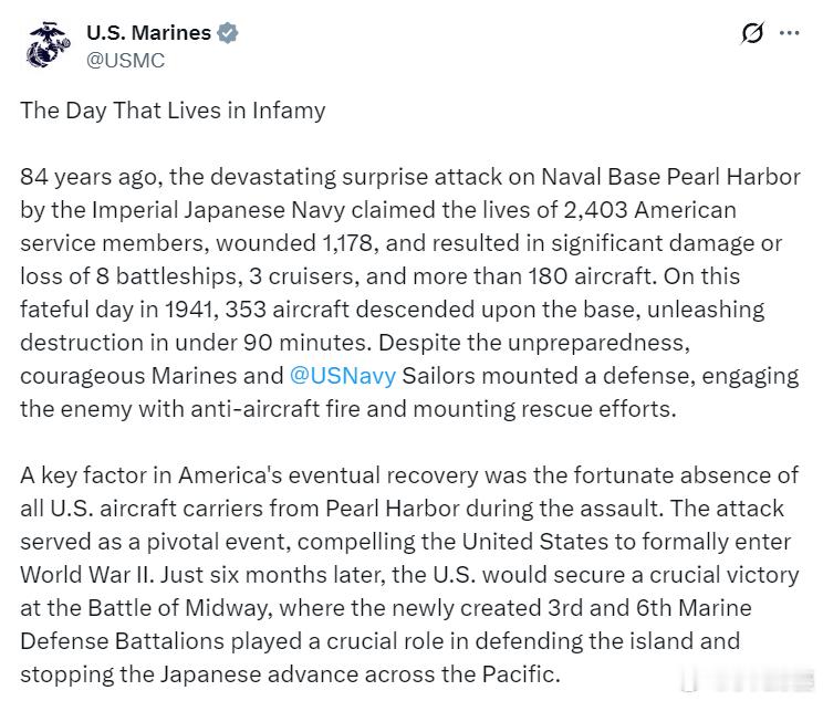 美国海军陆战队官方账号点名日本:“铭记珍珠港 1941年12月7日”网友:美军开始从二战正视历史了,有点意思。黄媒不会说的真相