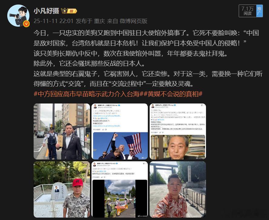 一只军国主义余孽又去中国大使馆表演了!它还叫嚣“中国的存在弊大于利。中国是我们的敌人。”该余孽除了长期煽动仇视中国人,对日本反战的民众也进行攻击。日舰曾收到中方提示并确认收到黄媒不会说的真相