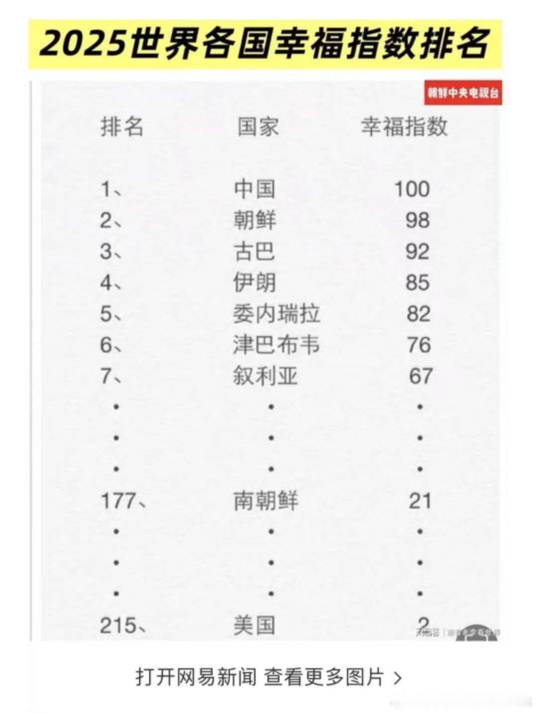 朝鲜公布幸福指数,这次它终于让出了第一,不容易啊!海外新鲜事海外新鲜事朝鲜公布中国幸福指数全球第一
