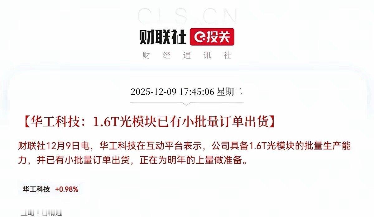 突发利好!华工科技突发利好!预计明日华工科技要跳空一字板了,满仓华工科技的股民们明日估计要吃上大肉了!下午5点45分,华工科技发布重磅消息称,公司具备1.6T光模块的批量生产能力,已经有小批量订单出货,明年有望大量出货,并且有消息称华工科技的1.6T产品已通过国际标准认证,并进入Meta、谷歌等国际云厂商的测试认证阶段,同时斩获超算中心亿元级订单,公司的全球竞争力显著提升,2026年随着1.6T光模块的量产,公司收入和利润也有望实现双位数增长,这个消息对于华工科技是重大利好,对于CPO板块来说也是火上浇油了股民们!坐稳扶好,受此利好消息刺激,明日华工科技恐怕是压不住,要起飞了,CPO概念也要继续大涨了!