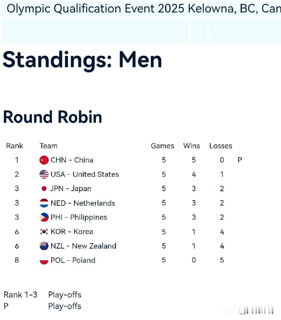 中国男子冰壶队率先获得2026年冬季奥运会资格赛附加赛资格 排名/团队/比赛轮数,胜,负 1 中 国5 5 0 (出线) 2 美 国5 4 1 3 日 本5 3 2 3 荷 兰5 3 2 3 菲律宾5 3 2 6 韩 国5 1 4 6 新西兰5 1 4 8 波 兰5 0 5 排名1-3名的队伍获得附加赛资格