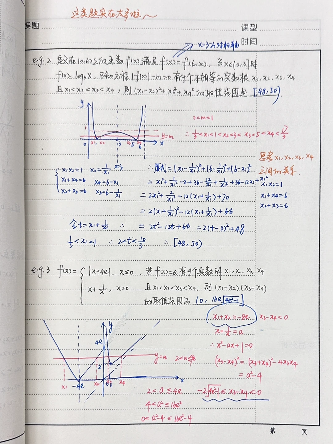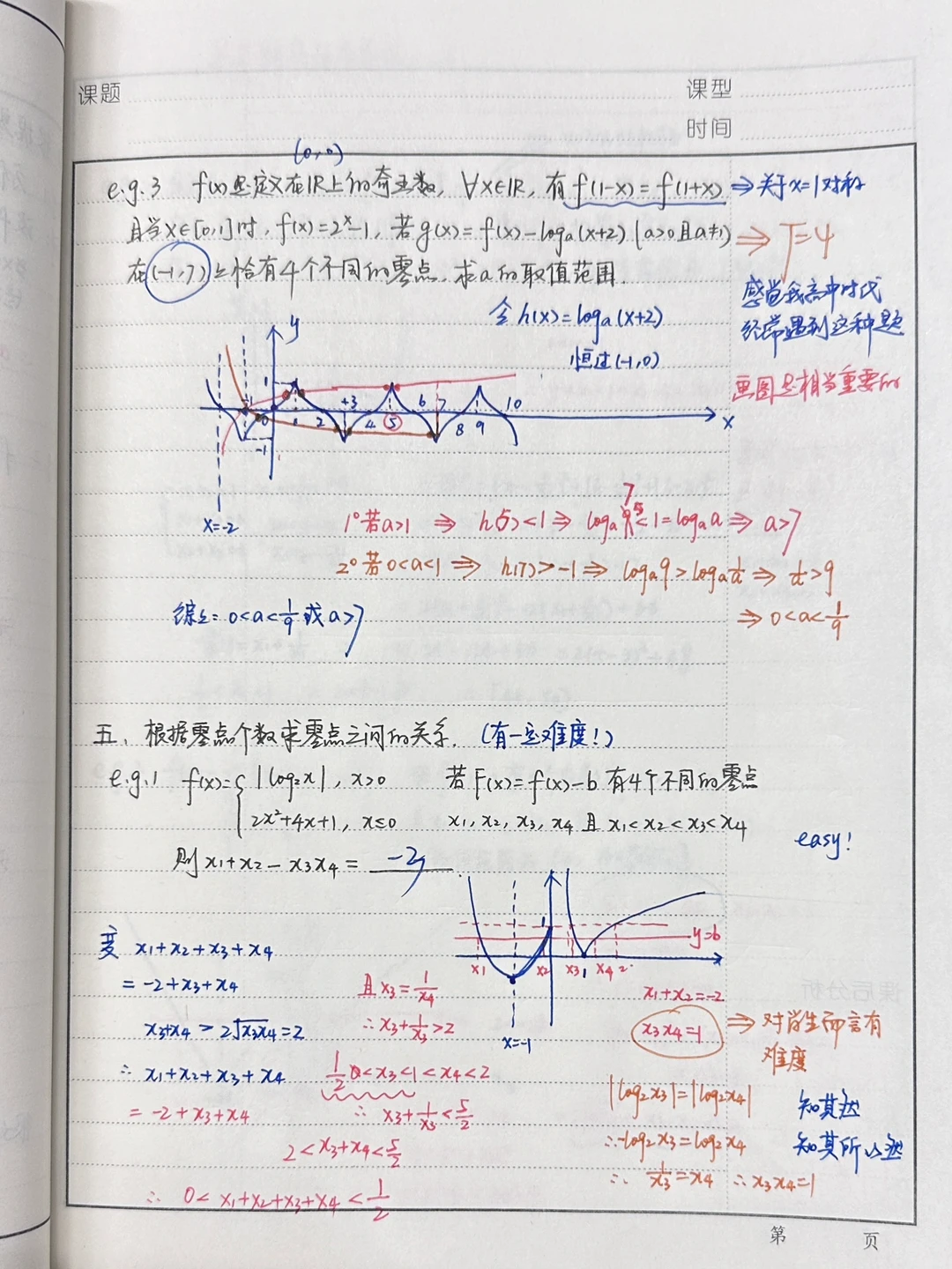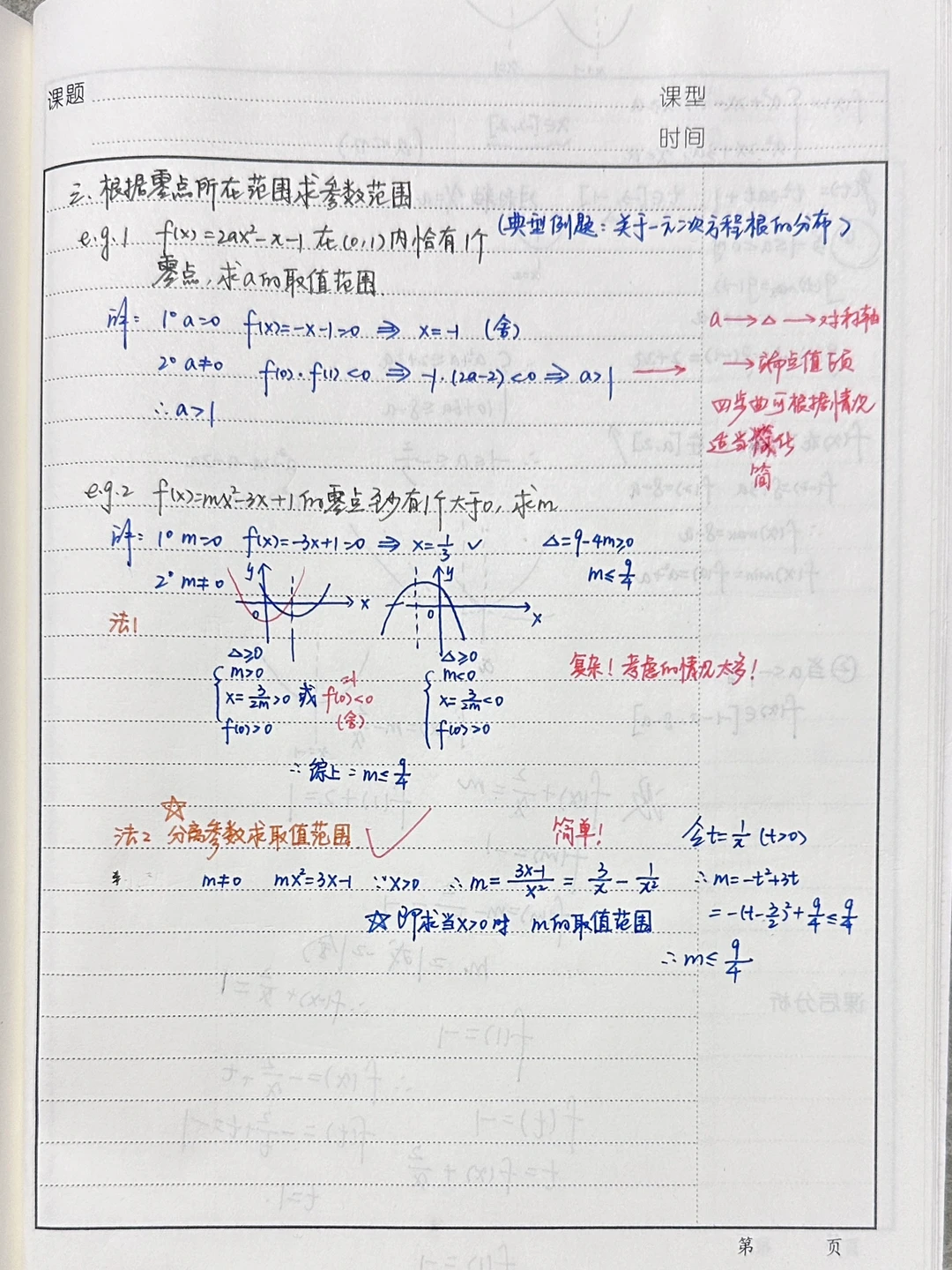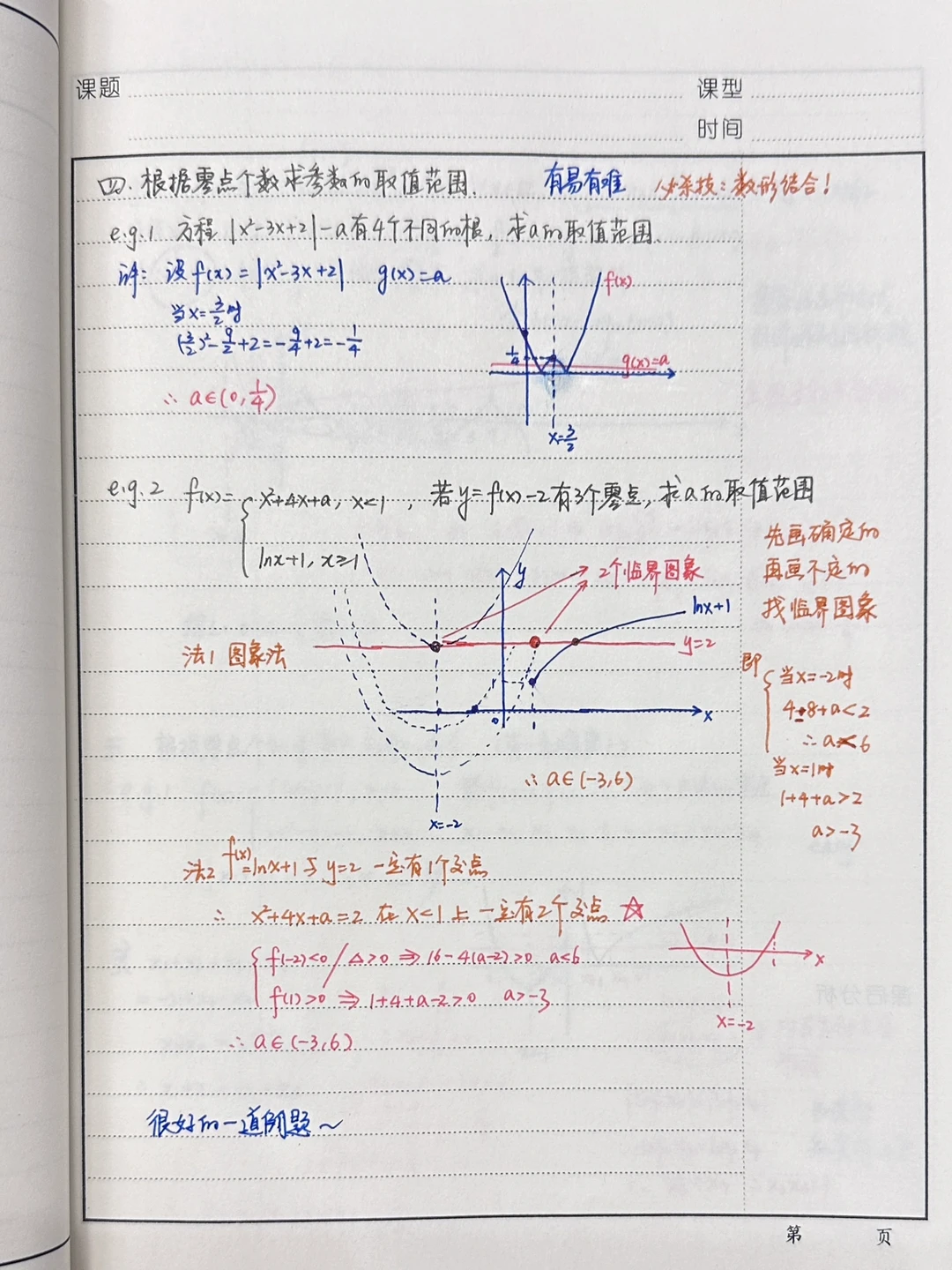 辛苦了一下午,准备了专题——函数的零点与方程的解(1)的授课内容,在这里打算把教学进度节奏放慢一点。 这篇笔记是第一部分内容,第二部分准备加入复合函数的零点问题,如果加上评讲作业,至少要花4到5节课哟,突然有点害怕,很有挑战性。 第二部分的内容包括:“自我嵌套”函数的零点问题和与其他函数“嵌套”函数的零点问题,还是很有难度的。 第一部分包括以上五个部分,详细见图片。 但说到底,老师讲是一方面,在这里还是希望同学们多做题,毕竟见题多了,数感好了,才能做到心中有数。