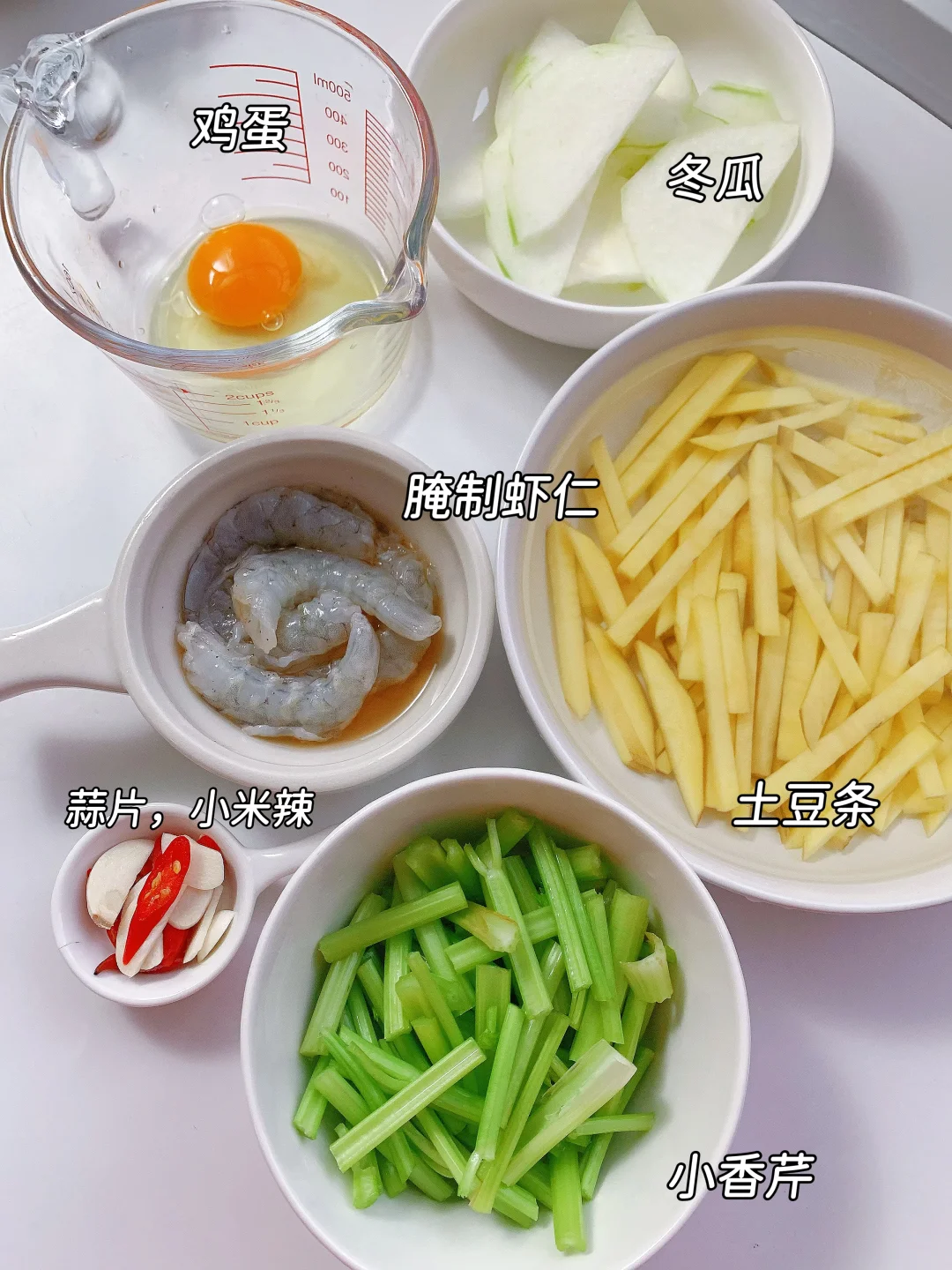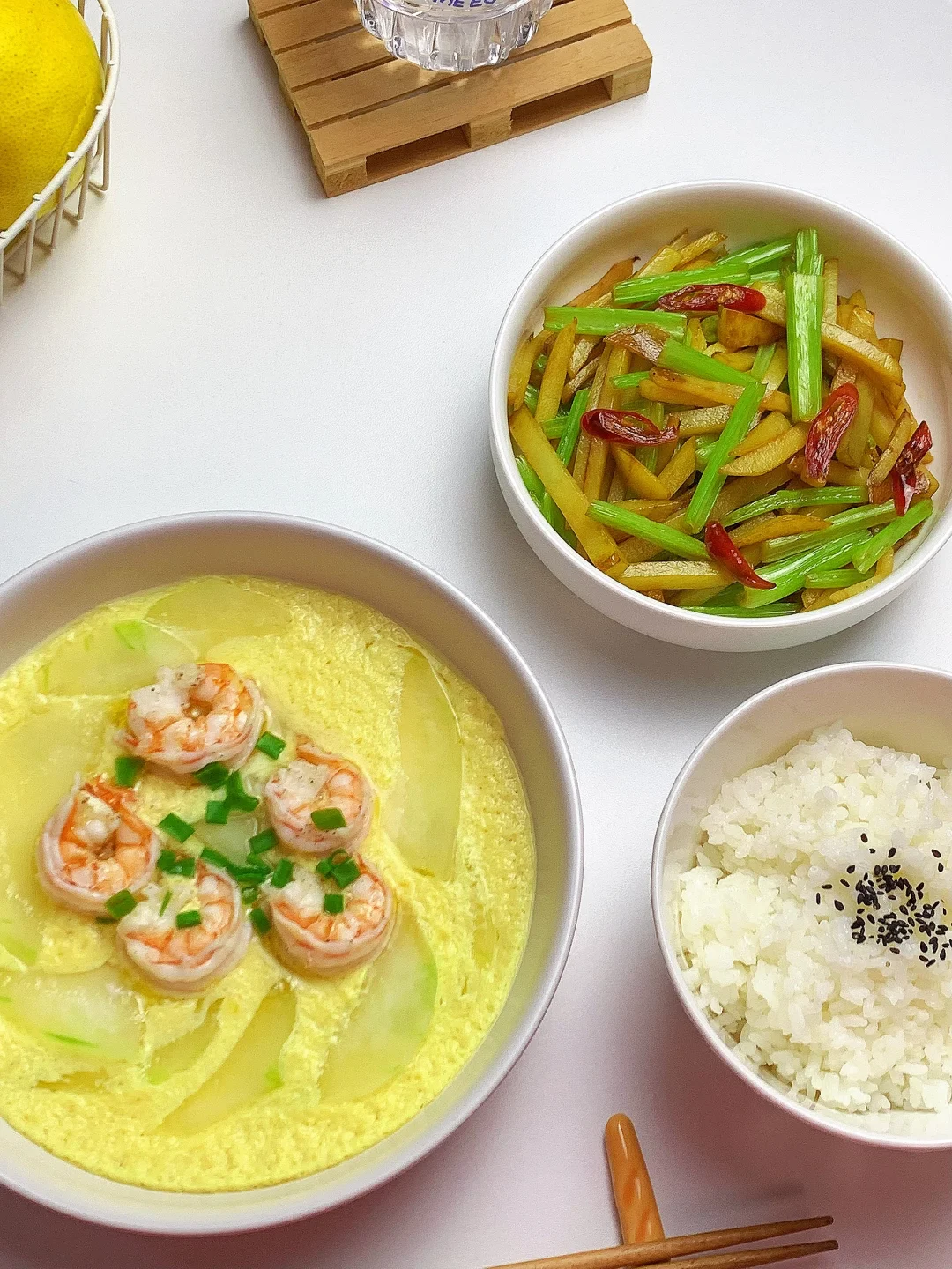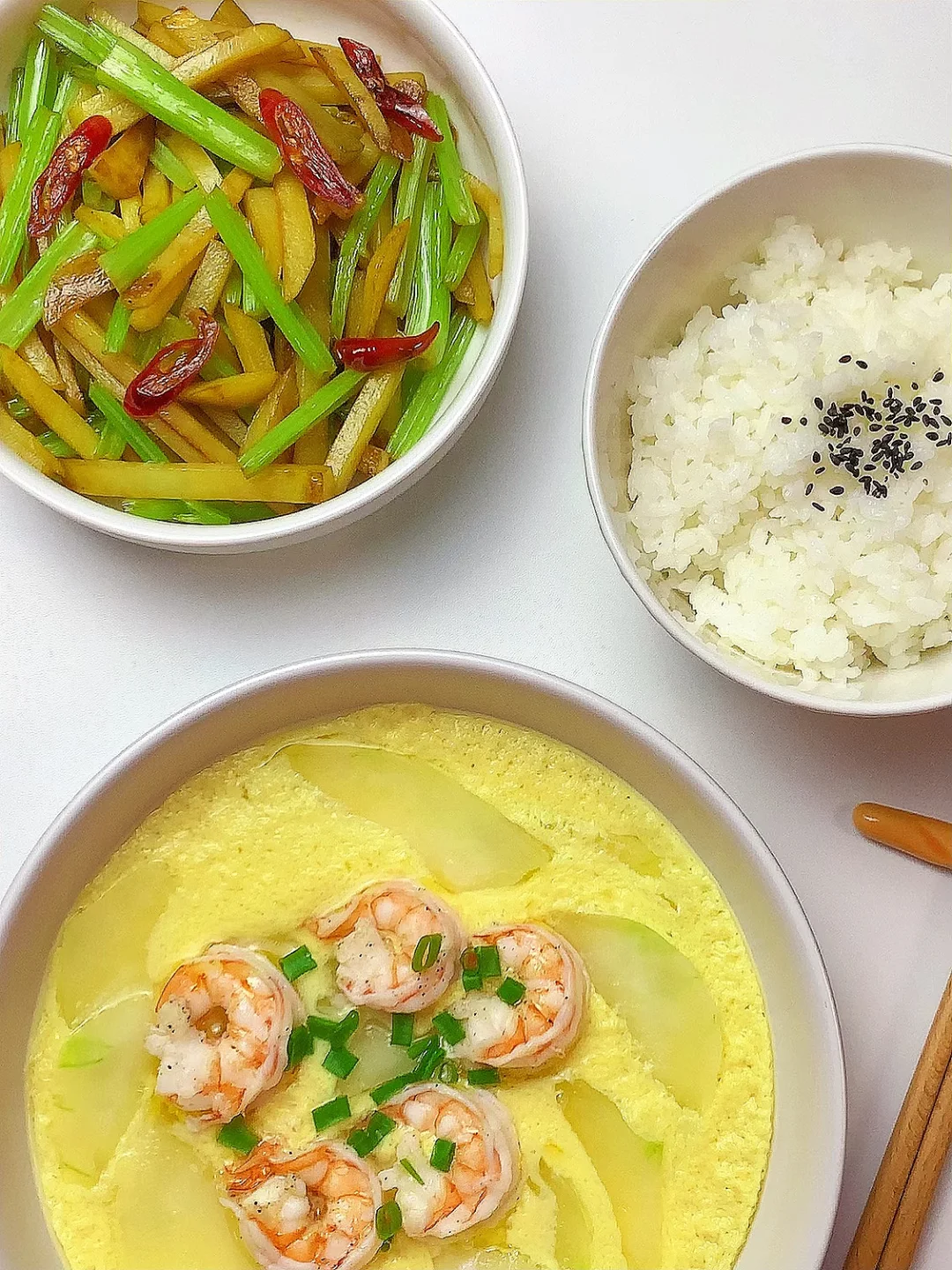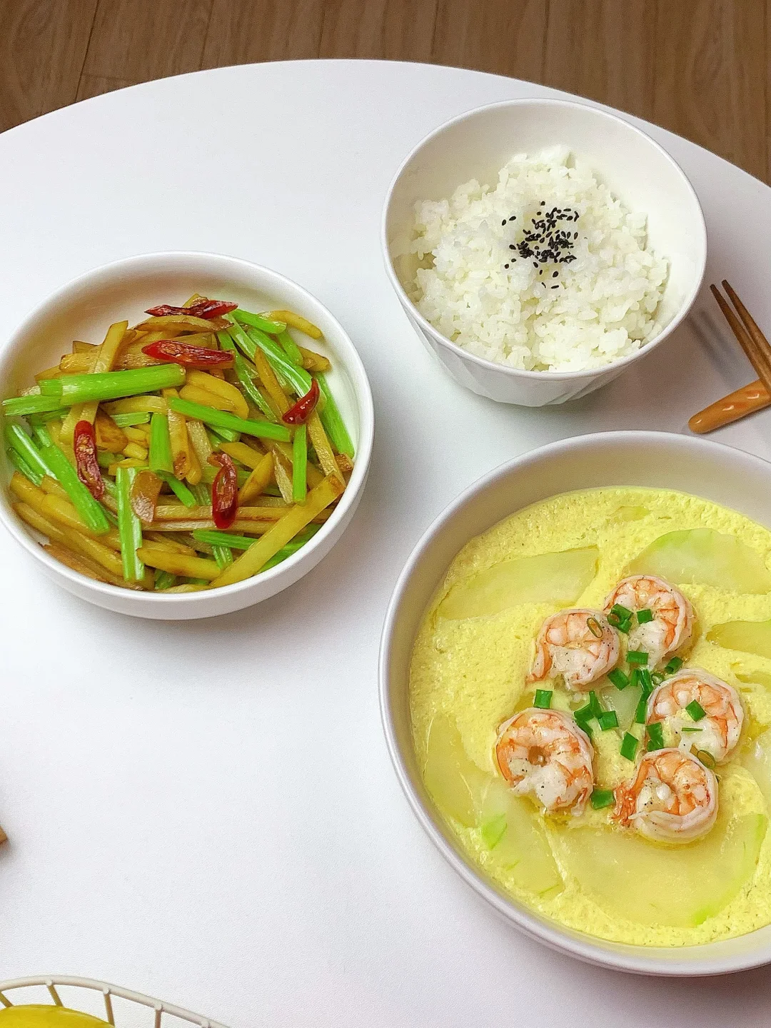 👩🏻🍳分享今日菜单 1️⃣冬瓜虾仁蒸蛋 2️⃣小香芹炒土豆 主食:米饭🍚 ……………………………………………………………………………… 🛒食材清单:鸡蛋 | 虾仁🦐 | 冬瓜 | 小香芹 | 土豆 📝早八打工人的一日三餐,拒绝外卖[偷笑R],坚持做饭的又一天,吃简单干净的饭菜~ ₍˄·͈༝·͈˄*₎◞ ̑̑