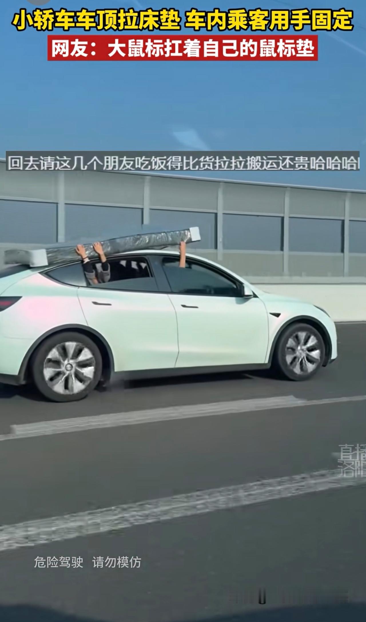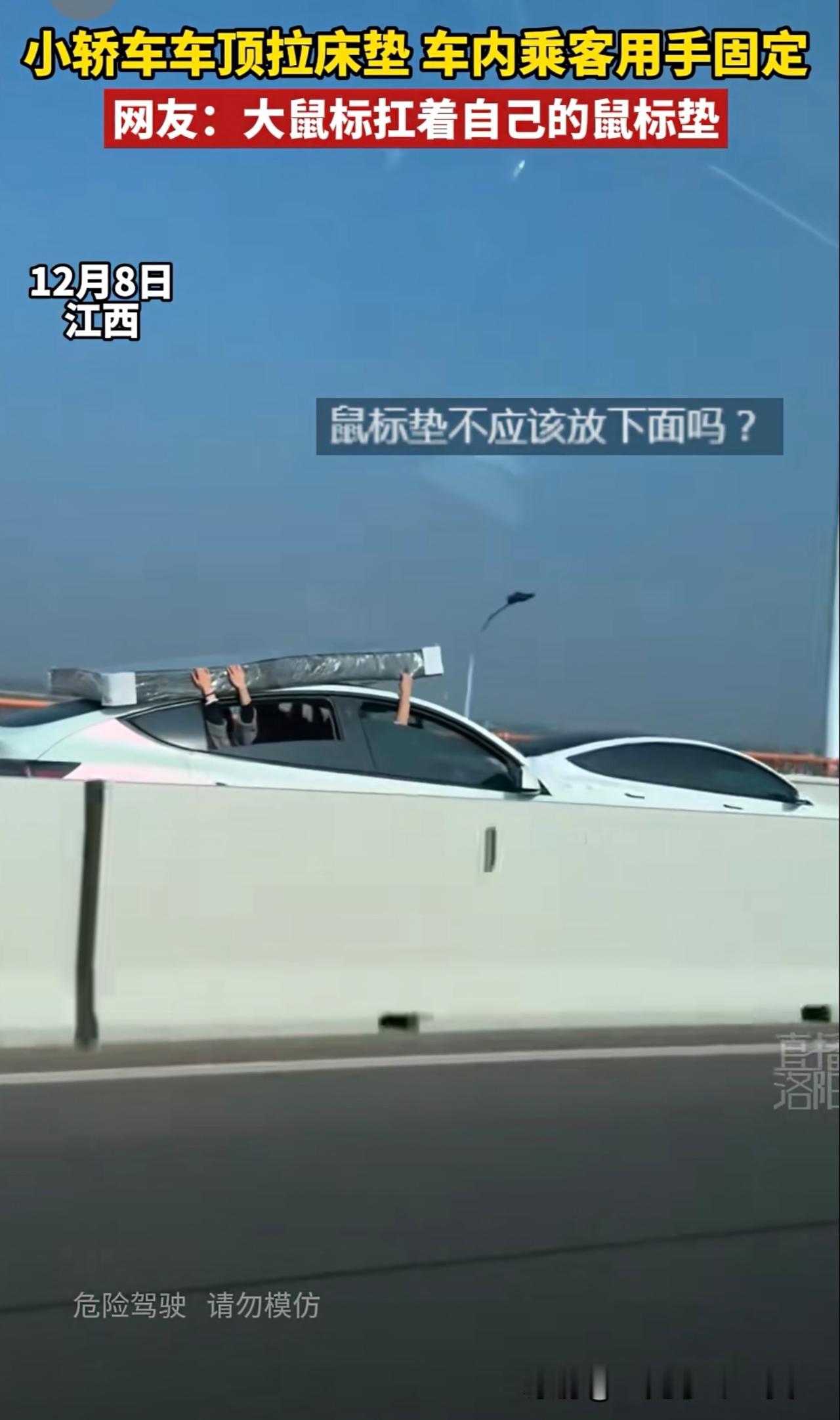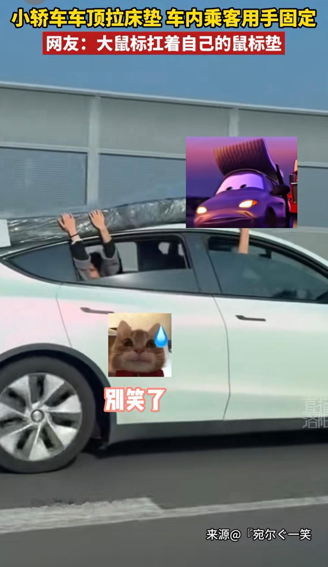 小轿车车顶拉床垫,车内乘客用手固定。网友:大鼠标扛着自己的鼠标垫[捂脸]
