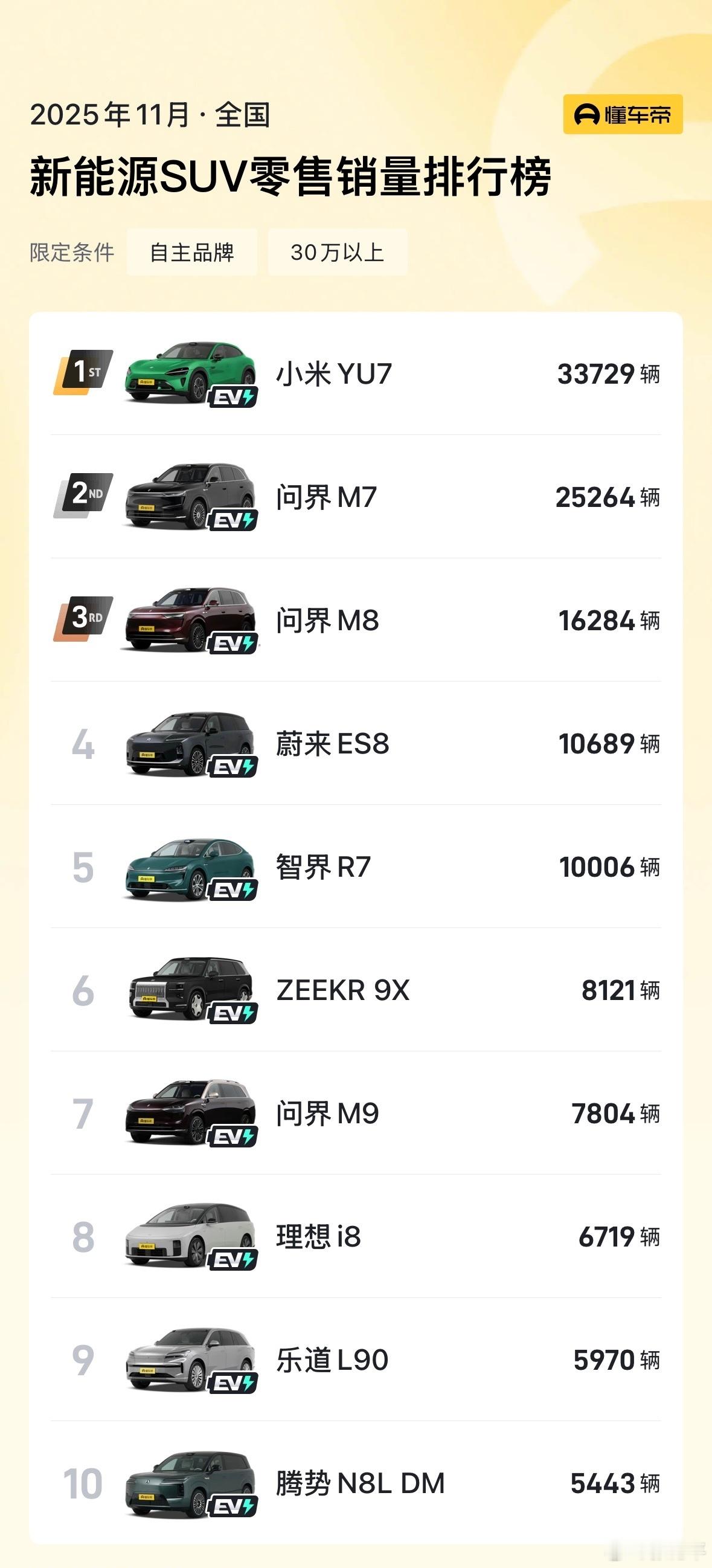 翻到一张鸿蒙销售发的河北30万以上SUV销量,应该是自己片区做的图。前三名分别是问界M7、小米YU7、坦克400。这种分地区的数据和整体比例差异化就很明显了。再仔细看了下,可能是还细分到了自主品牌新能源这个条件。因为合资没在榜,特斯拉也没在。我按照同样的条件看了下全国数据,前三分别是小米YU7、问界M7、问界M8。河北是长城总部所在地,主场表现还是挺好的。新能源汽车大v聊车