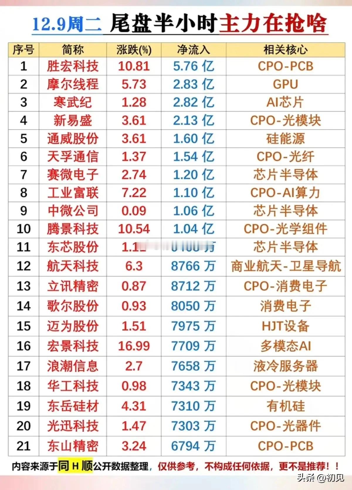 12.9尾盘半小时的主力抢筹梳理分析!今日核心聚焦CPO全产业链,同时叠加芯片半导体、AI算力、商业航天等硬科技赛道,消费电子、光伏HJT等细分领域也获资金布局;个股以科技标的为主,CPO相关标的占比超半数,部分个股涨停,体现当日尾盘主力对高景气硬科技赛道的集中加仓。1. 胜宏科技:净流入5.76亿居首,属于CPO-PCB领域。PCB是CPO硬件的核心基材,当前CPO是光通信高景气赛道,尾盘主力大额抢筹,既契合赛道逻辑,也体现资金对其CPO供应链卡位的短期情绪认可。2. 摩尔线程:净流入2.83亿,聚焦GPU赛道。GPU是AI算力核心硬件之一,作为国内GPU厂商,在AI算力需求扩容的背景下,尾盘获主力布局,反映市场对国产GPU细分赛道的关注。3. 寒武纪:净流入2.82亿,主打AI芯片。作为国产AI芯片代表企业,尽管当日涨幅温和,但主力尾盘大额流入,是资金长期看好其在AI芯片国产替代进程中潜力的体现。4. 新易盛:净流入2.13亿,属于CPO-光模块。光模块是CPO产业链核心组件,新易盛是该领域头部企业,尾盘资金抢筹,契合当前CPO赛道的高景气度,也指向市场对其业绩兑现的预期。5. 通威股份:净流入1.60亿,对应硅能源。作为硅能源产业链龙头,尾盘主力流入,或是资金看好硅能源在新能源领域的持续需求,叠加当日板块情绪回暖的驱动。6. 天孚通信:净流入1.54亿,属于CPO-光纤。光纤是CPO光通信的基础传输介质,天孚在光纤组件领域有卡位优势,尾盘资金布局,是CPO热度向细分环节扩散的体现。7. 赛微电子:净流入1.20亿,对应芯片半导体。聚焦MEMS等半导体细分制造环节,尾盘主力流入,反映资金对芯片半导体国产替代赛道的持续关注,短期板块情绪带动明显。8. 工业富联:净流入1.10亿,属于CPO-AI算力。作为AI算力硬件核心供应商,同时卡位CPO赛道,尾盘大涨+资金流入,体现其“CPO+AI算力”双重高景气标签的吸引力。9. 中微公司:净流入1.06亿,对应芯片半导体。作为芯片刻蚀机等核心设备的龙头,尽管当日涨幅微弱,但主力尾盘大额流入,是资金长期布局芯片设备国产替代逻辑的体现。10. 腾景科技:净流入1.04亿,属于CPO-光学组件。光学组件是CPO设备的关键细分部件,腾景在该领域有技术卡位,尾盘涨停+抢筹,是CPO细分环节热度升温的标志。11. 东芯股份:净流入9405万,对应芯片半导体。聚焦存储芯片等细分领域,尾盘主力流入,反映资金对存储芯片赛道的布局,契合半导体板块的整体热度。12. 航天科技: 净流入8766万,对应商业航天-卫星导航。商业航天是近期热点赛道,卫星导航是其核心应用环节,作为国企背景的相关标的,尾盘获资金布局,体现赛道情绪扩散。13. 立讯精密:净流入8712万,属于CPO-消费电子。作为消费电子龙头,同时布局CPO相关组件,尾盘资金流入,是资金对其“消费电子+CPO”跨界布局潜力的关注。14. 歌尔股份:净流入8050万,对应消费电子。作为消费电子龙头,尾盘主力流入,体现资金对消费电子行业底部复苏的预期,叠加短期板块情绪回暖。15. 迈为股份:净流入7975万,对应HJT设备。HJT是光伏电池下一代技术方向,迈为是该领域设备龙头,尾盘资金流入,反映资金对HJT技术产业化进程的看好。16. 宏景科技:净流入7709万,对应多模态AI。多模态AI是当前AI应用热门方向,宏景涉足相关领域,尾盘大幅上涨+资金流入,体现市场对该细分赛道的情绪追捧。17. 浪潮信息:净流入7658万,对应液冷服务器。液冷是高算力场景核心散热方案,浪潮是服务器龙头且布局液冷技术,尾盘资金流入,契合AI算力升级带动的液冷需求增长逻辑。18. 华工科技:净流入7343万,属于CPO-光模块。作为光模块领域重要参与者,同时卡位CPO赛道,尾盘资金流入,是CPO头部企业持续获资金关注的体现。19. 东岳硅材:净流入7310万,对应有机硅。作为有机硅龙头,其产品应用于多领域,尾盘大涨+资金流入,或是资金看好有机硅需求的边际改善,叠加板块情绪升温。20. 光迅科技:净流入7303万,属于CPO-光器件。光器件是CPO光通信核心部件,光迅是该领域龙头,尾盘资金流入,体现CPO全产业链的资金覆盖度提升。总结今日尾盘主力的抢筹方向高度集中于CPO全产业链,同时兼顾芯片半导体、AI算力等硬科技赛道,消费电子、光伏HJT等细分领域也获边际布局。整体逻辑是“高景气赛道+细分卡位”,部分标的涨幅温和但资金流入明显,体现短期情绪与长期产业逻辑的结合。本文涉及资讯、数据等内容来自网络公共信息,仅供参考,不构成投资建议!