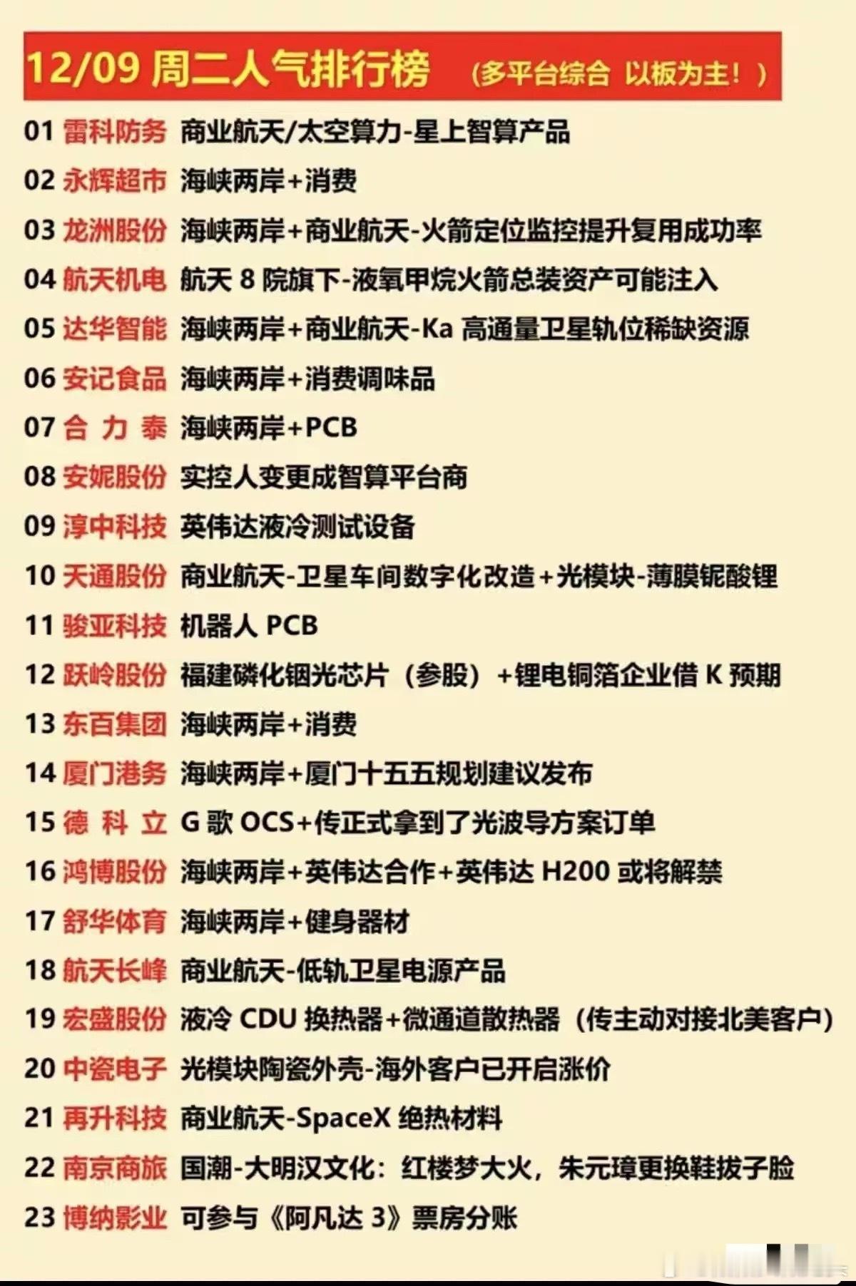 12月9日个股人气榜!今日核心聚焦“海峡两岸”“商业航天”两大主线,同时叠加消费、算力硬件、光通信、国潮等热点;个股热度多由政策预期、产业绑定、订单/资产整合题材驱动,是当日市场情绪偏好的集中体现。1. 雷科防务:主打商业航天领域的星上智算产品,踩中太空算力新兴赛道——星载智能计算是低轨卫星组网的核心配套,这类稀缺性太空技术标的,自然收获了当前市场的高关注度。2. 永辉超市:叠加海峡两岸+消费概念。作为连锁商超龙头,在两岸消费流通政策预期下,有望受益于区域消费回暖,近期消费板块情绪升温,也进一步推高了它的人气。3. 龙洲股份:兼具海峡两岸+商业航天概念,聚焦火箭定位监控以提升复用成功率。火箭回收复用是商业航天降本关键,其配套技术在行业扩容期需求提升,叠加区域题材后人气快速上升。4. 航天机电:背靠航天8院,传出液氧甲烷火箭总装资产注入预期。液氧甲烷是商业航天主流推进剂,若资产注入落地,将直接切入火箭总装核心环节,这一整合预期是其人气核心驱动力。5. 达华智能:叠加海峡两岸+商业航天,聚焦Ka高通量卫星轨位资源。Ka频段卫星是高通量通信核心载体,轨位属稀缺资源,叠加区域政策预期,使其在商业航天细分领域获高关注。6. 安记食品:绑定海峡两岸+消费调味品概念。作为调味品企业,在两岸消费协同政策预期下,有望受益于区域供应链整合或需求释放,借助“消费+区域”双热点跻身人气榜。7. 合力泰:叠加海峡两岸+PC B概念。PCB是电子设备核心基材,在区域电子产业配套需求预期下,其PCB业务或迎增量,短期借助双概念获得市场情绪加持。8. 安妮股份:实控人变更为智算平台商,带来业务转型预期。智算平台是AI算力基础设施核心,市场看好其切入智算赛道的潜力,这一变更事件直接驱动了它的人气。9. 淳中科技:聚焦英伟达的液冷测试设备。液冷是高算力场景关键散热方案,绑定英伟达头部供应链本身具关注度,其液冷测试设备的卡位推高了人气。10. 天通股份:覆盖商业航天+光模块双赛道,涉及卫星车间数字化改造与光模块核心材料薄膜铌酸锂。卫星数字化提升产业效率,薄膜铌酸锂是光模块升级关键,双重题材加持人气。11. 骏亚科技:主打机器人PCB概念。PCB是机器人电子系统核心部件,当前机器人产业扩容,上游PCB需求同步提升,其细分领域卡位自然获得市场关注。12. 跃岭股份:叠加参股福建磷化铟光芯片+锂电铜箔企业借壳预期。磷化铟是光芯片核心材料,锂电铜箔是锂电池关键部件,双产业题材+借壳预期,多重看点推高人气。13. 东百集团:绑定海峡两岸+消费概念。作为商业零售企业,在两岸消费联动预期下,有望受益于区域商业流通改善,借助消费情绪+区域题材进入人气榜。14. 厦门港务:叠加海峡两岸+厦门十五五规划建议发布。厦门是两岸交流核心节点,“十五五”规划或涉区域基建、物流,作为港口物流企业,直接受益于这一规划预期。15. 德科立:拿到谷歌OCS+光波导方案订单。OCS是光通信核心设备,光波导是光模块关键技术,绑定谷歌头部客户且订单落地,业绩兑现预期驱动了它的人气。16. 鸿博股份:覆盖海峡两岸+英伟达合作+H200解禁预期。英伟达H200是高端算力芯片,合作+解禁预期下,市场看好其算力业务推进,叠加区域概念后人气居高不下。17. 舒华体育:绑定海峡两岸+健身器材概念。健身器材属消费品类,在两岸消费协同预期下,其产品或拓展区域市场,借助“消费+区域”双热点获市场情绪关注。18. 航天长峰:聚焦商业航天的低轨卫星电源产品。低轨卫星组网对电源可靠性要求极高,电源是卫星核心部件,在商业航天扩容期,其配套产品需求提升推高人气。19. 宏盛股份:布局液冷CDU换热器+微通道散热器,传主动对接北美客户。液冷是算力、新能源散热关键,北美客户订单预期,打开了业绩增长的想象空间。20. 中瓷电子:主打光模块陶瓷外壳,海外客户已涨价。陶瓷外壳是光模块核心组件,海外客户涨价意味着产品议价能力提升,业绩有望直接受益,这一利好驱动市场关注。21. 再升科技:供应SpaceX的商业航天绝热材料。SpaceX是商业航天全球龙头,绝热材料是火箭、卫星关键材料,进入其供应链意味着技术认可度高,赛道+龙头绑定推高人气。22. 南京商旅:绑定国潮-大明汉文化,借《红楼梦》大火+朱元璋形象调整热度。国潮文化近期受消费市场关注,其绑定文化热点的思路,借助国潮题材收获当日人气。总结今日人气榜的核心主线是“海峡两岸”与“商业航天”,同时穿插消费、算力等细分热点;个股热度多依赖题材炒作,如政策预期、头部企业绑定等。不过这类标的的持续性,仍需后续跟踪业务落地、业绩兑现等基本面情况。本文涉及资讯、数据等内容来自网络公共信息,仅供参考,不构成投资建议!
