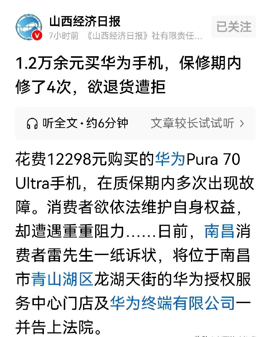 江西南昌,男子花12298元买了一部华为手机,使用一年后,手机出现卡顿、死机、暗屏多个问题。男子将手机送到服务中心维修,取回后,发现原有问题没解决,手机后盖又出现密封不严,维修人员说需返厂处理,之后,手机经过4次维修,始终没解决问题。男子对品牌失去信心,质保期内要求退换机,被拒后,将对方告上法庭,要求赔偿12298元购机款,以及精神损失费1元。而最终的结局,令所有人意想不到! 在消费维权的江湖里,如果你问一位普通消费者,把商家告上法庭能赢回什么?大多数人的预期顶多是拿回本金,最好再让对方道个歉。 但在江西南昌发生的这起“万元机皇维权案”,结局却狠狠刷新了所有人的认知——消费者不仅拿回了全款,还反向让大厂倒贴了8000元的“慰问金”。这一记回旋镖,可以说是结结实实地打在了“售后傲慢”的脸上。 整件事的荒诞感,首先源于那部售价高达12298元的“工业废铁”。雷先生手里这台华为Pura70Ultra,原本寄托着他对国产顶级旗舰的全部信任。2024年4月19日入手,质保期明明写着两年,可偏偏就像被设了定时炸弹一样,刚满一年后的2025年4月20日,手机瞬间崩盘。 卡顿、死机、屏幕发暗,这“连环套”一般的故障组合,完全不像是一个单价过万的高端设备该有的表现,倒像是个几百块的山寨货。 更让人血压升高的,是所谓的“官方授权服务”。当雷先生火急火燎地把“半残”的手机送去南昌的授权中心时,维修主管嘴上说得头头是道,认定是主板故障,得等配件更换。可等第二天拿到维修单一看,上面的操作记录竟然变成了轻描淡写的“参数调整”和“手机保养”。 这种“头痛医头,脚痛修脚”的糊弄文学,直接导致雷先生把手机取回家后,不仅老毛病一个没好,甚至多出了一个新毛病——手机后盖密封不严。修手机修成了“拆手机”,这种技术水平实在令人咋舌。 随后的剧情简直是“凡尔赛”式的折磨。因为那个莫名其妙裂开的后盖,维修方两手一摊表示搞不定,必须返厂。这期间反反复复折腾,雷先生唯一的诉求就是“彻底修好”。直到5月3日,店家通知由于死机问题已修复、后盖处理完毕可以取机,这场大戏才迎来了真正的高潮。 那一天的取机现场,堪称售后人员的“大型翻车现场”。雷先生这回长了个心眼,没拿回家试,而是当着店长、主管和所有顾客的面,直接现场开机演示。结果极其尴尬:屏幕依旧发暗,之前没修好也就算了,现场还直接崩出了一个新的致命BUG——微信数据无法传输。 就在众目睽睽之下,所谓“经过原厂精修”的手机,表现得如同砖头。维修主管在一旁尴尬得恨不得找地缝钻进去,只能灰溜溜地把手机又抱回了维修间。 都已经到了这步田地,按常理说,换个新机来平息怒火是最起码的操作吧?但店方居然还在玩弄“文字游戏”。 面对雷先生愤怒提出的退换货要求,店长竟然搬出了一套令人窒息的逻辑:虽然这台手机在短期内已经进出维修站4次,但那是“检测”和“保养”,不属于“实质性维修”。根据“同一故障维修两次修不好才能换机”的条款,雷先生还没攒够换机资格。 这番言论彻底引爆了雷先生。合着消费者花了一万多买手机,不仅要忍受故障,还要配合售后玩这种“重新定义维修”的概念游戏?既然道理讲不通,那就只能法律见。 雷先生一纸诉状将授权中心告上了法庭,诉求写得非常有意思:除了要回12298元的购机款外,他还索赔了1元钱的精神损失费。这一块钱,争的就是那口气,就是为了撕开对方那层傲慢的遮羞布。 这种硬碰硬的态度,终于让傲慢的资本低了头。就在法院即将开庭的节骨眼上,品牌方大概也意识到如果这事儿在法庭上公开审理,不仅必输无疑,品牌声誉更是会碎得稀烂。于是他们主动求和,起初试图用一款“即将上市的新款手机”来置换,企图用新品的诱惑来抹平这段不愉快的经历。 但此时的雷先生早已看透了本质——他对这个品牌已经丧失了最基本的信任底线。什么新款旧款,远不如真金白银来得实在。 面对雷先生坚决退款的要求,对方最终不得不拿出了惊人的诚意方案:不仅全额退还了12298元的购机款,为了弥补这一连串骚操作带来的恶劣影响,还额外支付了8000元的慰问金。 从一开始被店长拿着“霸王条款”硬怼,到最后不仅原价退货还多了小一万的赔偿,雷先生这起案子给所有消费者上了一课:当大公司的“技术权威”和“售后流程”成为推诿责任的挡箭牌时,法律才是击碎这层硬壳的最强铁锤。 这8000元,罚的不仅仅是修不好的手机,更是那无数次试图把消费者当傻子忽悠的傲慢。最终,雷先生拿钱撤诉,这一场原本充满压抑的维权战,竟以一种极其解气的方式画上了句号。 参考消息:江西新闻网. (2025, 12,8). 花 1.2 万余元买华为手机 保修期内修了 4 次 欲退货遭拒.