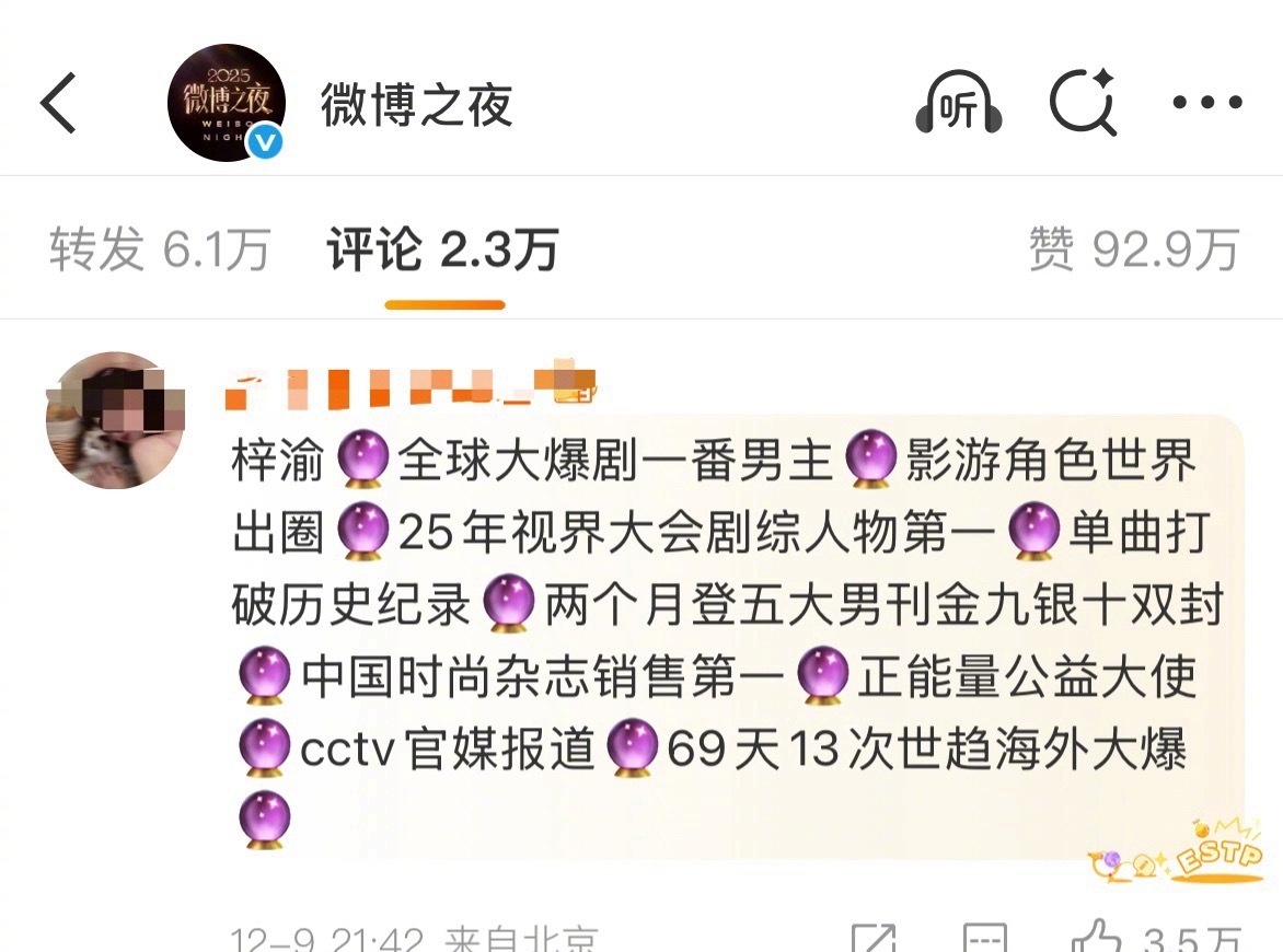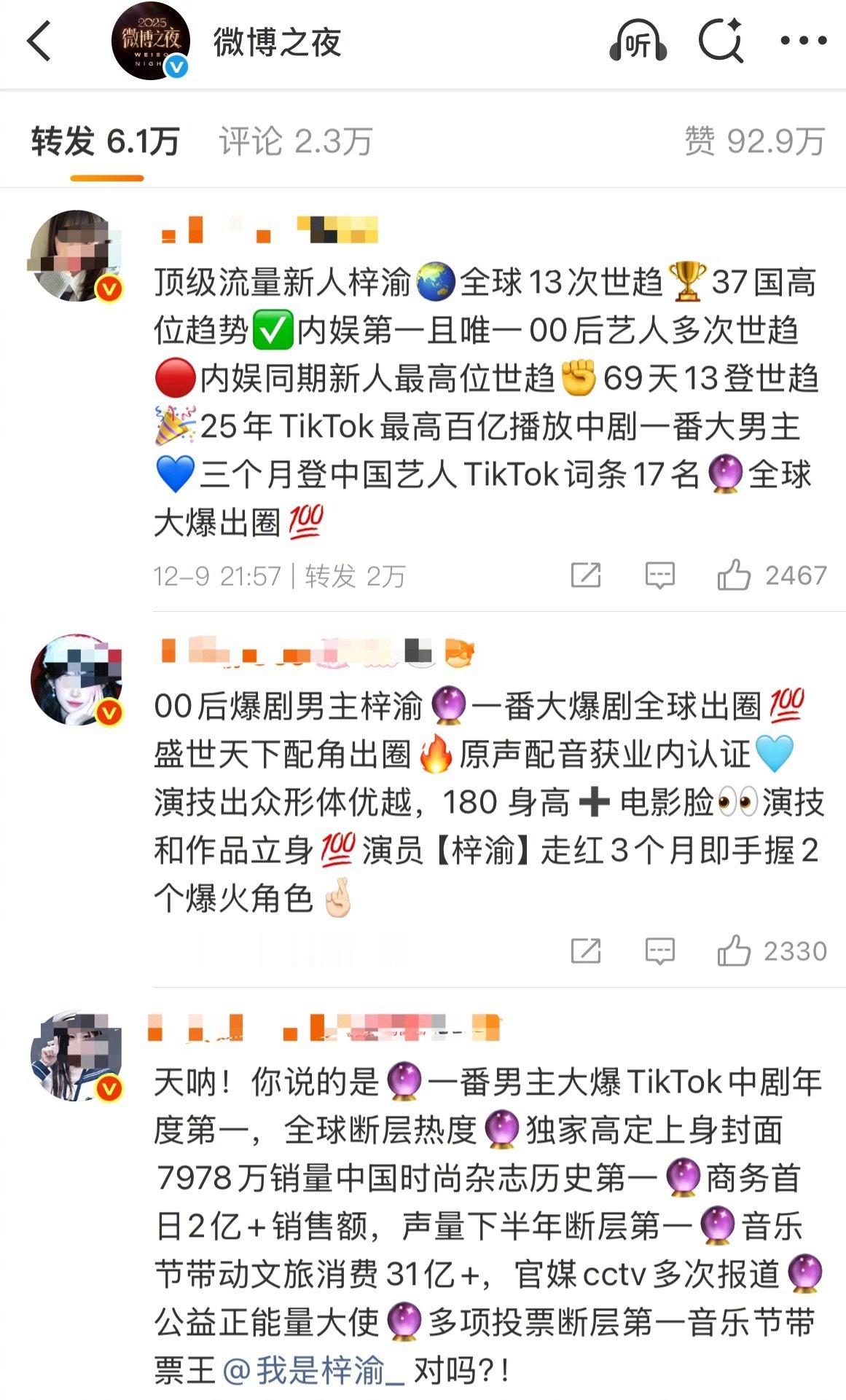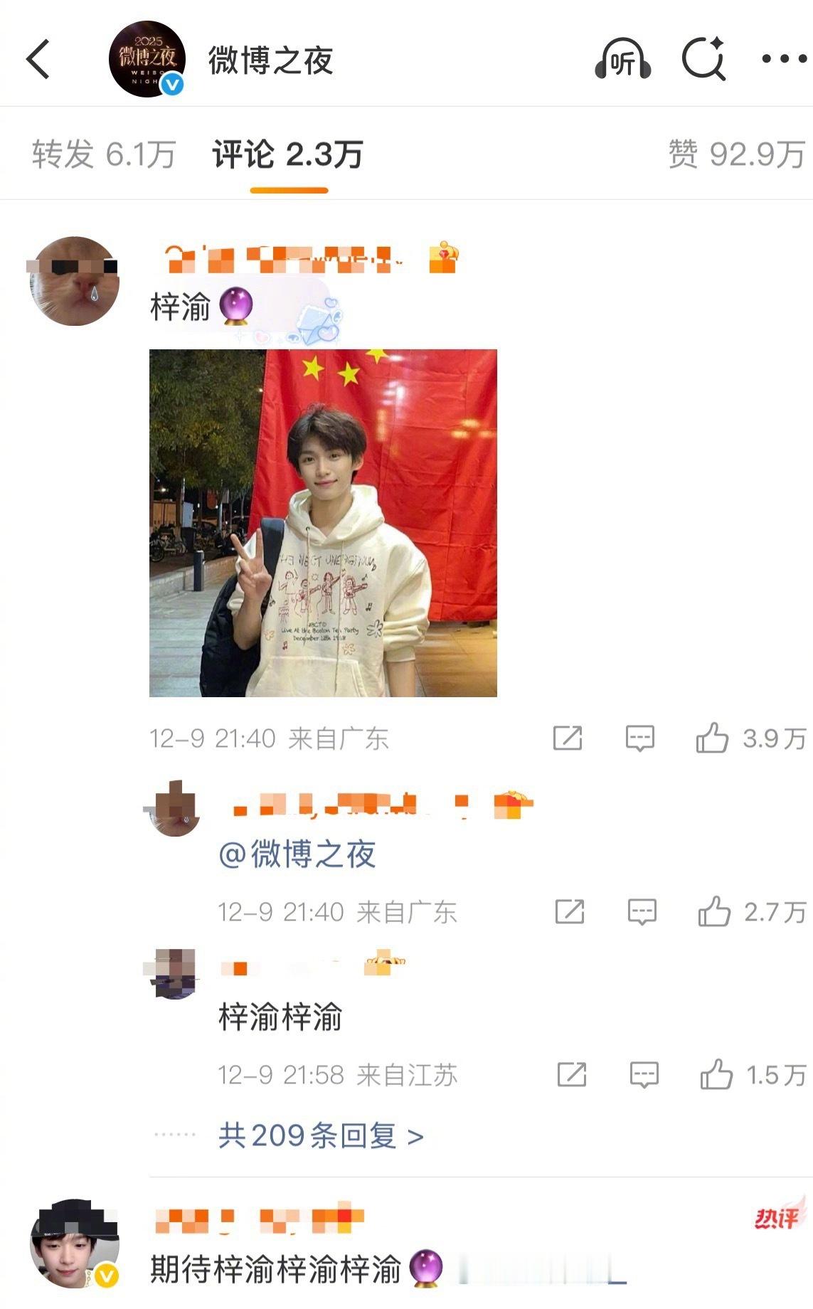 微博之夜送票博热转 热评全是梓渝的粉丝。