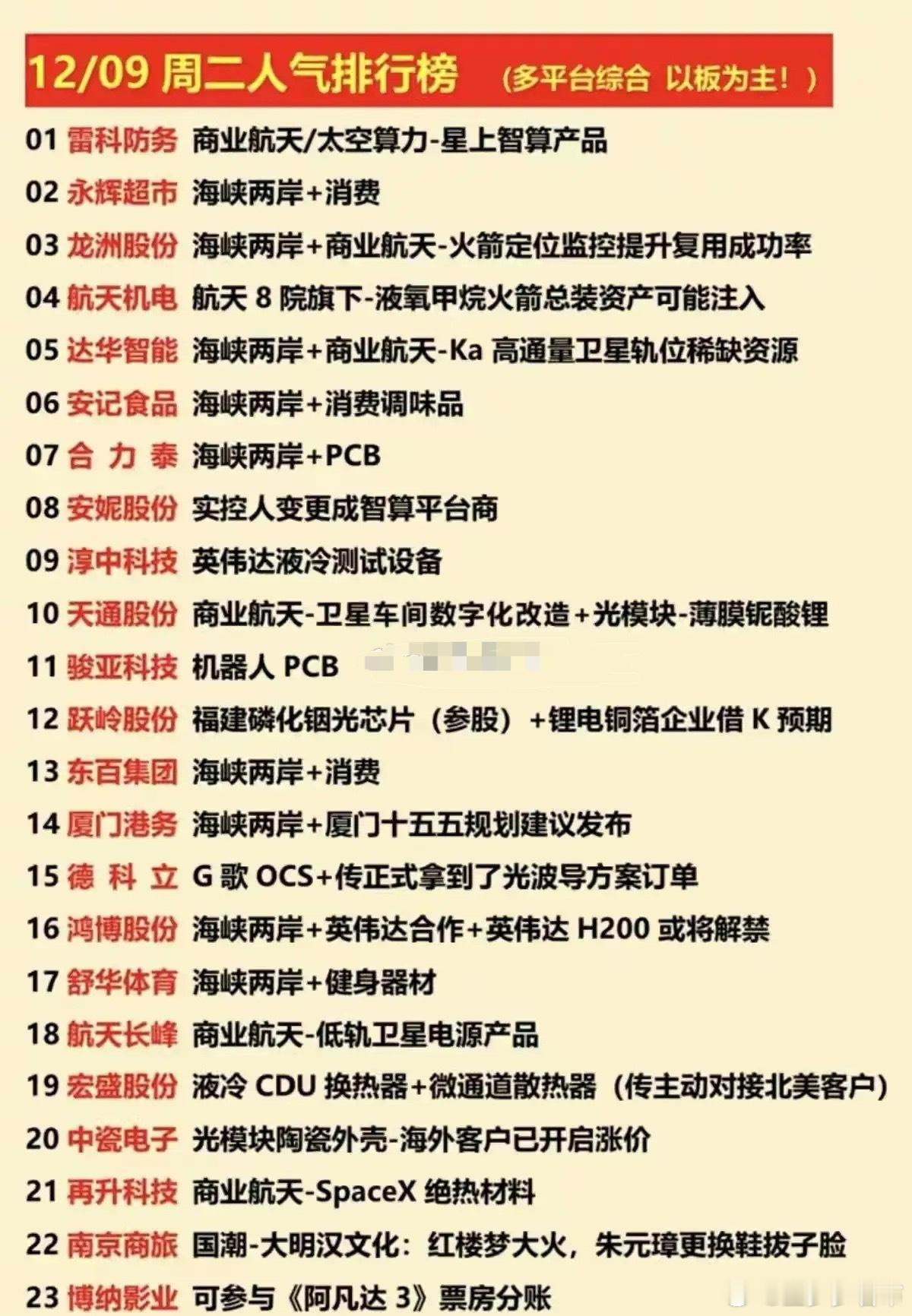 12月9日个股人气榜!今日核心聚焦“海峡两岸”“商业航天”两大主线,同时叠加消费、算力硬件、光通信、国潮等热点;个股热度多由政策预期、产业绑定、订单/资产整合题材驱动,是当日市场情绪偏好的集中体现。1. 雷科防务:主打商业航天领域的星上智算产品,踩中太空算力新兴赛道——星载智能计算是低轨卫星组网的核心配套,这类稀缺性太空技术标的,自然收获了当前市场的高关注度。2. 永辉超市:叠加海峡两岸+消费概念。作为连锁商超龙头,在两岸消费流通政策预期下,有望受益于区域消费回暖,近期消费板块情绪升温,也进一步推高了它的人气。3. 龙洲股份:兼具海峡两岸+商业航天概念,聚焦火箭定位监控以提升复用成功率。火箭回收复用是商业航天降本关键,其配套技术在行业扩容期需求提升,叠加区域题材后人气快速上升。4. 航天机电:背靠航天8院,传出液氧甲烷火箭总装资产注入预期。液氧甲烷是商业航天主流推进剂,若资产注入落地,将直接切入火箭总装核心环节,这一整合预期是其人气核心驱动力。5. 达华智能:叠加海峡两岸+商业航天,聚焦Ka高通量卫星轨位资源。Ka频段卫星是高通量通信核心载体,轨位属稀缺资源,叠加区域政策预期,使其在商业航天细分领域获高关注。6. 安记食品:绑定海峡两岸+消费调味品概念。作为调味品企业,在两岸消费协同政策预期下,有望受益于区域供应链整合或需求释放,借助“消费+区域”双热点跻身人气榜。7. 合力泰:叠加海峡两岸+PC B概念。PCB是电子设备核心基材,在区域电子产业配套需求预期下,其PCB业务或迎增量,短期借助双概念获得市场情绪加持。8. 安妮股份:实控人变更为智算平台商,带来业务转型预期。智算平台是AI算力基础设施核心,市场看好其切入智算赛道的潜力,这一变更事件直接驱动了它的人气。9. 淳中科技:聚焦英伟达的液冷测试设备。液冷是高算力场景关键散热方案,绑定英伟达头部供应链本身具关注度,其液冷测试设备的卡位推高了人气。10. 天通股份:覆盖商业航天+光模块双赛道,涉及卫星车间数字化改造与光模块核心材料薄膜铌酸锂。卫星数字化提升产业效率,薄膜铌酸锂是光模块升级关键,双重题材加持人气。11. 骏亚科技:主打机器人PCB概念。PCB是机器人电子系统核心部件,当前机器人产业扩容,上游PCB需求同步提升,其细分领域卡位自然获得市场关注。12. 跃岭股份:叠加参股福建磷化铟光芯片+锂电铜箔企业借壳预期。磷化铟是光芯片核心材料,锂电铜箔是锂电池关键部件,双产业题材+借壳预期,多重看点推高人气。13. 东百集团:绑定海峡两岸+消费概念。作为商业零售企业,在两岸消费联动预期下,有望受益于区域商业流通改善,借助消费情绪+区域题材进入人气榜。14. 厦门港务:叠加海峡两岸+厦门十五五规划建议发布。厦门是两岸交流核心节点,“十五五”规划或涉区域基建、物流,作为港口物流企业,直接受益于这一规划预期。15. 德科立:拿到谷歌OCS+光波导方案订单。OCS是光通信核心设备,光波导是光模块关键技术,绑定谷歌头部客户且订单落地,业绩兑现预期驱动了它的人气。16. 鸿博股份:覆盖海峡两岸+英伟达合作+H200解禁预期。英伟达H200是高端算力芯片,合作+解禁预期下,市场看好其算力业务推进,叠加区域概念后人气居高不下。17. 舒华体育:绑定海峡两岸+健身器材概念。健身器材属消费品类,在两岸消费协同预期下,其产品或拓展区域市场,借助“消费+区域”双热点获市场情绪关注。18. 航天长峰:聚焦商业航天的低轨卫星电源产品。低轨卫星组网对电源可靠性要求极高,电源是卫星核心部件,在商业航天扩容期,其配套产品需求提升推高人气。19. 宏盛股份:布局液冷CDU换热器+微通道散热器,传主动对接北美客户。液冷是算力、新能源散热关键,北美客户订单预期,打开了业绩增长的想象空间。20. 中瓷电子:主打光模块陶瓷外壳,海外客户已涨价。陶瓷外壳是光模块核心组件,海外客户涨价意味着产品议价能力提升,业绩有望直接受益,这一利好驱动市场关注。21. 再升科技:供应SpaceX的商业航天绝热材料。SpaceX是商业航天全球龙头,绝热材料是火箭、卫星关键材料,进入其供应链意味着技术认可度高,赛道+龙头绑定推高人气。22. 南京商旅:绑定国潮-大明汉文化,借《红楼梦》大火+朱元璋形象调整热度。国潮文化近期受消费市场关注,其绑定文化热点的思路,借助国潮题材收获当日人气。总结今日人气榜的核心主线是“海峡两岸”与“商业航天”,同时穿插消费、算力等细分热点;个股热度多依赖题材炒作,如政策预期、头部企业绑定等。不过这类标的的持续性,仍需后续跟踪业务落地、业绩兑现等基本面情况。本文涉及资讯、数据等内容来自网络公共信息,仅供参考,不构成投资建议!
