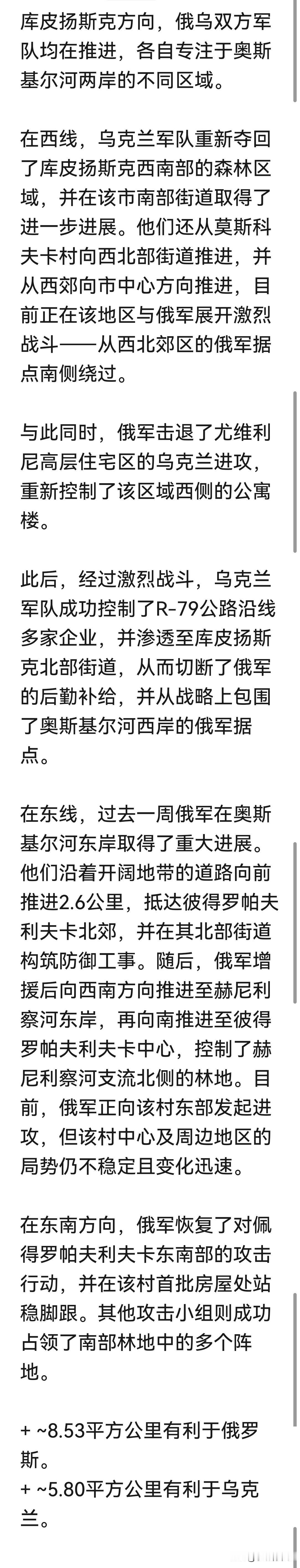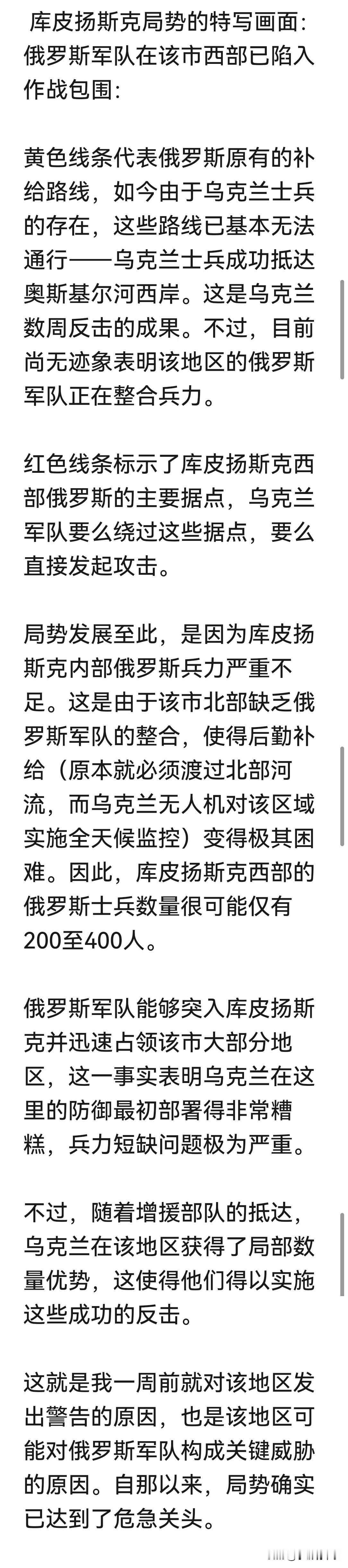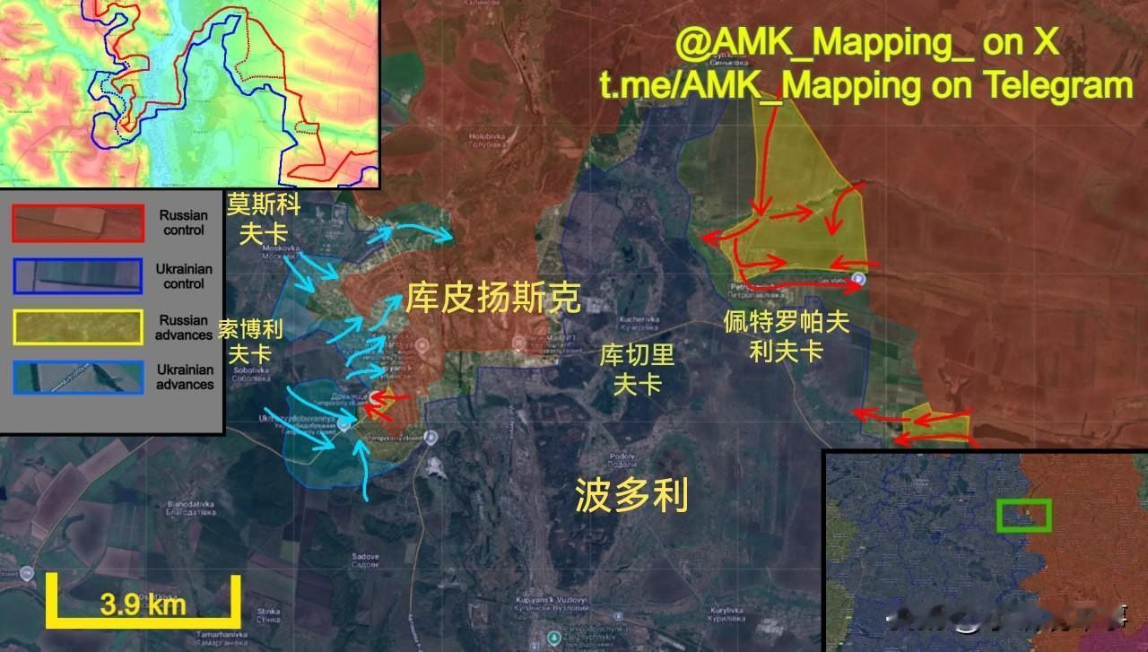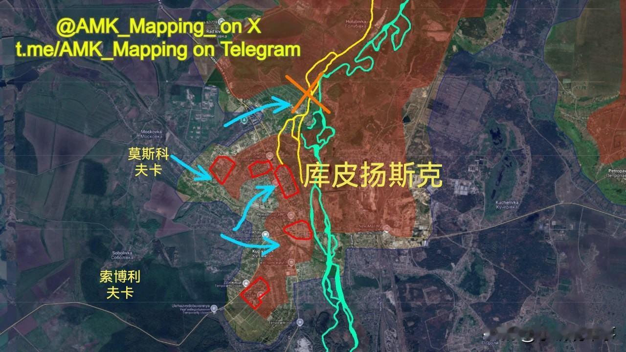 AMK发布的地图显示,乌军继续在库皮扬斯克市推进,该市的俄军部队可能要被包围。俄军则在库皮扬斯克市以东方向推进。 库皮扬斯克战斗 库皮扬斯克战事 库皮扬斯克战况 库皮扬斯克战役 乌东前线局势 俄罗斯前线战报