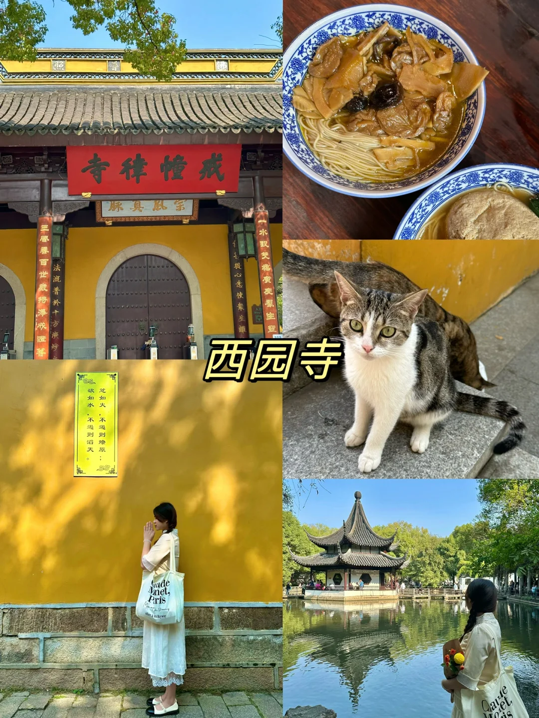 ✔️第五天早起去西园寺,吃素面素包,后院还能撸猫🐈。最后去山塘街,体验汉服或乌篷船,有时间可以留下来看夜景,别有韵味。