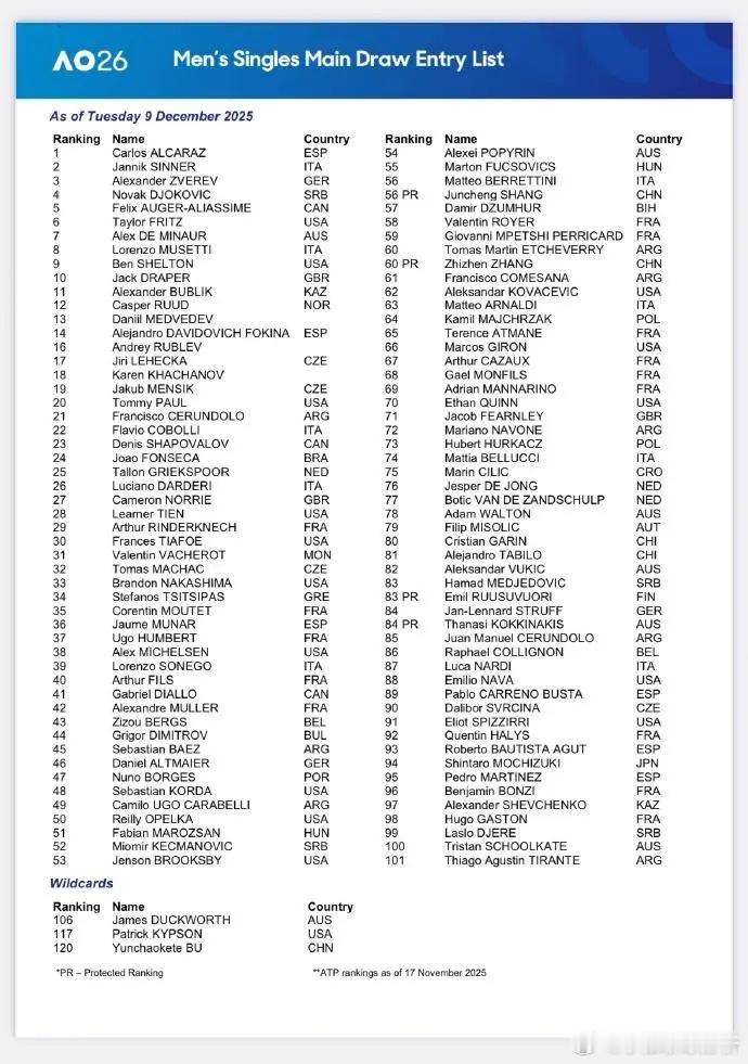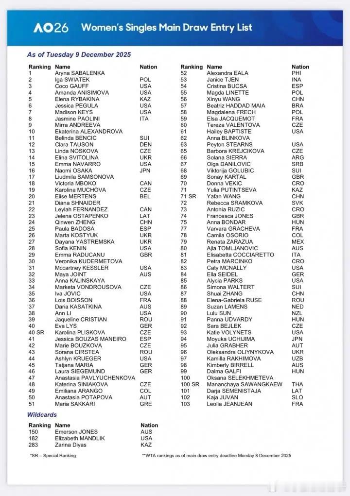 澳网官宣正赛名单:郑钦文领衔中国7人 阿卡德约凯斯领衔男女单北京时间12月9日,澳网官宣2026年单打正赛名单,中国军团7人入围,其中女单郑钦文领衔,还有王欣瑜、王雅繁与张帅入围,男单则是商竣程、张之臻与布云朝克特入围。澳网男单由卫冕冠军阿尔卡拉斯、辛纳与德约科维奇领衔,女单由萨巴伦卡、斯瓦泰克与卫冕冠军凯斯领衔。2026年澳网单打中国入围参赛球员:女单:郑钦文、王欣瑜、王雅繁、张帅男单:商竣程、张之臻、布云朝克特郑钦文生涯最佳澳网成绩是获得女单亚军,她在2025年的温网一轮游后,之后做手术缺席美网,且在中网短暂复出后再度伤退,连续缺席多站赛事提前赛季报销。郑钦文在2026年复出后的表现相当令人期待,尤其是她将领衔中国军团在澳网冲击佳绩。除此之外,王欣瑜与王雅繁也是入围澳网女单正赛,其中王雅繁是凭借保护排名入围,36岁的张帅作为老将在2025年的年底不断参赛逆袭,也是收获一个澳网单打正赛名额。至于中国男单则是3人入围,其中商竣程与张之臻均是凭借保护排名入围正赛,布云朝克特则是凭借在澳网外卡赛夺冠获得一张外卡。除了中国球员之外,澳网男单由阿尔卡拉斯与卫冕冠军辛纳领衔,还有澳网赛会十冠王德约科维奇,女单由世界第一的萨巴伦卡领衔,还有卫冕冠军凯斯与斯瓦泰克等名将。2026年澳网将在1月12日-2月1日进行,其中1月12日-15日为澳网资格赛,澳网正赛从1月18日开始进行。