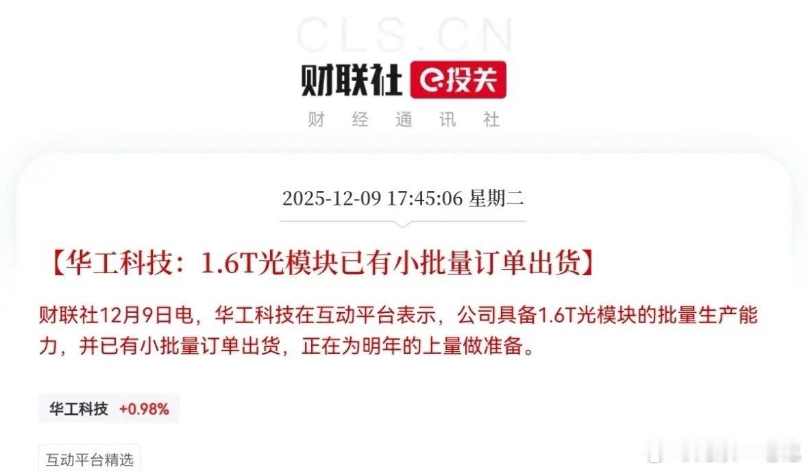 突发利好!华工科技突发利好!预计明日华工科技要跳空一字板了,满仓华工科技的股民们明日估计要吃上大肉了!下午5点45分,华工科技发布重磅消息称,公司具备1.6T光模块的批量生产能力,已经有小批量订单出货,明年有望大量出货,并且有消息称华工科技的1.6T产品已通过国际标准认证,并进入Meta、谷歌等国际云厂商的测试认证阶段,同时斩获超算中心亿元级订单,公司的全球竞争力显著提升,2026年随着1.6T光模块的量产,公司收入和利润也有望实现双位数增长,这个消息对于华工科技是重大利好,对于CPO板块来说也是火上浇油了股民们!坐稳扶好,受此利好消息刺激,明日华工科技恐怕是压不住,要起飞了,CPO概念也要继续大涨了!
