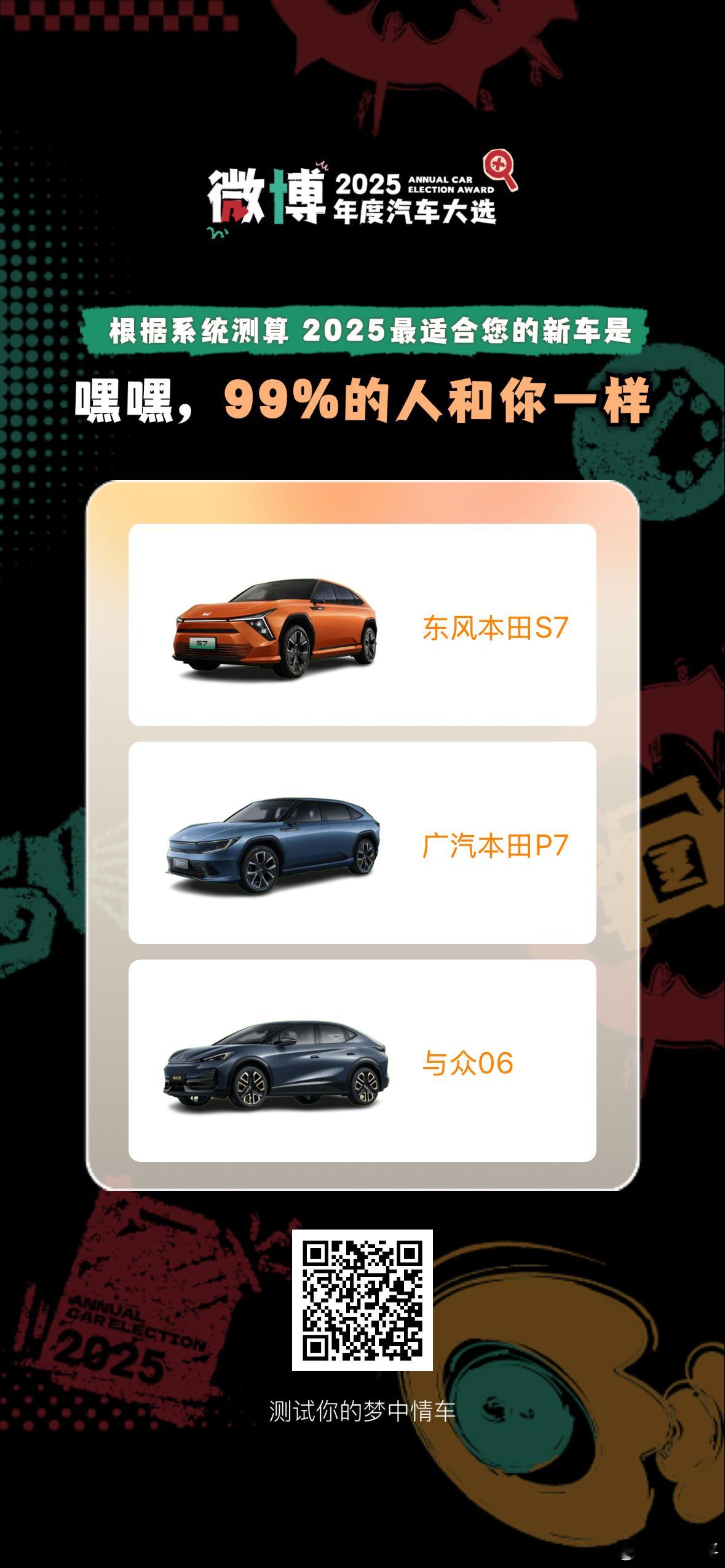 我特么……玩了一下微博的那个模拟选车活动,整整40道题,认认真真答完,最后你给我推荐了这么三款车??我怎么记得过程中品牌偏好还选了新势力呢!而且辅助驾驶要好用!颜值设计和科技配置都很重要!他说最适合我的是东本S7、广本P7、与众06。还有99%的人和我一样,说吧,是谁?
