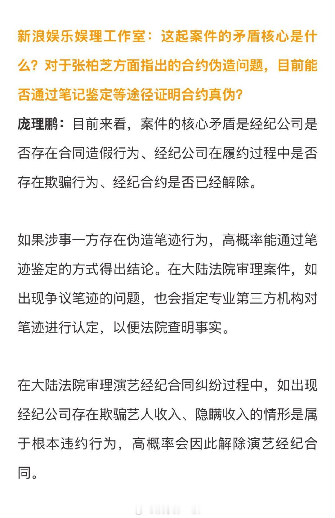 律师解读张柏芝合约纠纷案 律师谈张柏芝法庭表现 今天上午,香港高等法院续审张柏芝与前经纪人余毓兴的合约纠纷案,今天也是张柏芝第三次出席庭审。谈及张柏芝在庭审时的相关表现,庞理鹏律师向新浪娱乐工作室解读道:“庭审是查明事实、适用法律的严肃程序,当事人需恪守诉讼秩序,围绕争议焦点理性陈述、举证质证。艺人作为公众人物,应考虑在公开庭审中的表现会被媒体传播,但同时艺人也是涉事者,对于自己觉得委屈或者无法接受之处,不可避免地可能会有些情绪表达。即便存在情绪激动情形,艺人的庭审表现通常不会直接影响判决结果,法院会保持中立,根据合同约定、客观证据来综合评判。”娱理独家↓