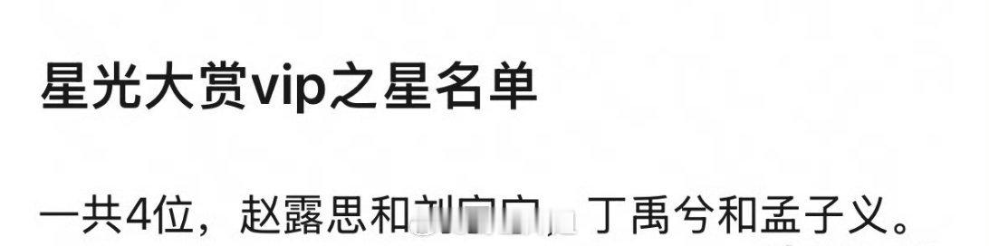 网传的星光大赏VIP之星名单,有赵露思、刘宇宁、丁禹兮、孟子义,好像这几位今年热度真不差,你觉得可信度高不?