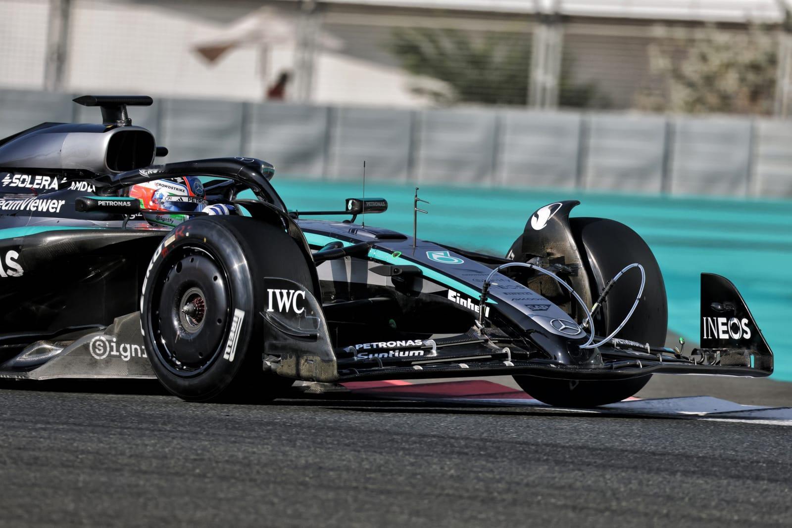 f1 在今天的阿布扎比2026轮胎测试中,安东内利驾驶的 F1“骡车”为了模拟明年的主动空气动力学设计,在前翼翼片上安装了一套驱动装置,用于模拟前翼的“开合”状态~
