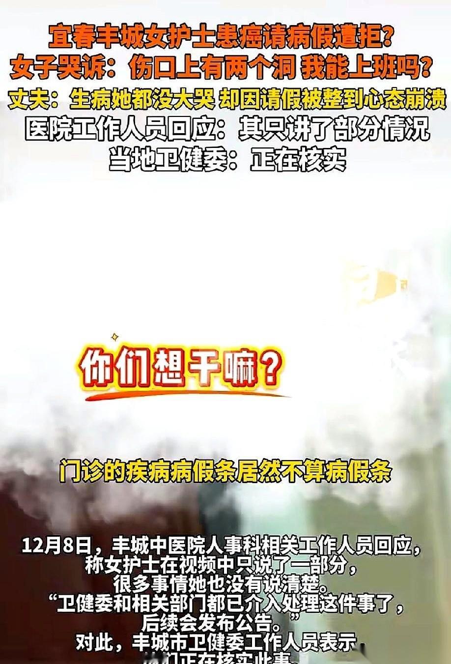 拿着肺癌诊断书去请假,结果被自己工作的医院给拒了。 我真的,看到这个新闻的时候,一口气没上来。 就因为假条是门诊开的,所以不算数?最多只能给一个月的事假? 姐,你是在逗我吗? 人家姑娘是肺癌啊!是要开刀做手术的,术后身上还留着两个洞啊!你让她一个月就回来上班?上什么班?给你表演一个带伤操作,还是现场直播伤口崩裂? 五年,整整五年。 在ICU里连轴转,熬夜熬到心慌气短,最后熬出了癌。 我总以为,医院这种地方,再怎么没人情味,对自己的员工,尤其是一个病倒在岗位上的护士,总该有点起码的怜悯和人性吧? 结果呢? 等来的不是安慰,不是“你好好休息,科里有我们”。 等来的是领导冷冰冰的“不行”,是护理主任劈头盖脸的责骂。 那一刻,病痛的折磨估计都比不上心里的寒。 把人当耗材,用到油尽灯枯,发现你坏了,不仅不给修,还嫌你耽误事儿。这操作,绝了。 最讽刺的是什么? 是救死扶伤的地方,在用最冷酷的方式,把自己的员工推开。 “我们从没让她带病上班。” “她只讲了部分情况。” 呵呵,这公关话术我都会背了。 有时候觉得挺没劲的。 我们总被教育要奉献,要燃烧自己。可烧完了,剩下的一地灰,谁管你,谁疼你? 真希望那姑娘能好好养病,然后拿起法律武器,别怂。 因为有些地方,你越是体谅,它越是得寸进尺。 你把它当家,它把你当驴。