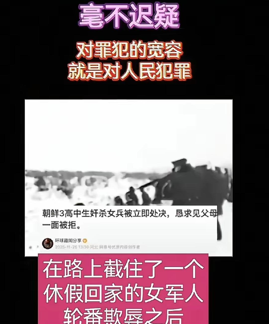 朝鲜又出狠事了, 三名未成年人性侵杀害一名休假女军人, 直接被朝鲜处死! 据悉,三名被执行者均为在校高中生,他们的罪行非常恶劣,侵犯并杀害一名女军人,这不仅伤害了无辜女性的性命,也伤害了国家和军人的荣誉。 这件事发生在黄海北道苔滩郡。去年夏天,一名刚退伍的女兵坐公交车回家,车半路坏了,她只能走路。三个高三男生路过,见她长得清秀,起了歹心,把人拖到偏僻地方侵害了。 完事后,三人怕事情败露,直接把人杀了。女兵临死前哭着说想再见爸妈一面,还是没能活下来。三人拎着女兵的行李箱想坐车跑路,结果上了同一辆公交车。 司机眼尖,认出箱子是刚才下车那姑娘的,觉得不对劲,直接把车开到了安全部门。三人当场被抓,很快就认了罪。警察到现场找到了遗体。 朝鲜对军人荣誉看得很重。案子报上去没几天,平壤就下令立刻处决。三个人虽然还没成年,但碰了这条红线,没留任何余地。青少年犯罪在朝鲜这两年确实多了些,街头混混、盗窃抢劫都有。 这事之后,朝鲜开了紧急会议,说要全面整顿青少年不良行为,还成立了专门小组。学校管得更严了,晚上不许随意外出,社区也加强了巡逻。脱北者组织SAND研究所旗下的媒体最先爆出了细节。 朝鲜法律对侵害军人、损害国家形象的行为向来从重。三个孩子书没读完,人生刚开始,就走到头了。案子在当地传开,家长吓得不行,纷纷加紧管教自家孩子。 这类事给全社会敲了警钟。青少年教育光靠学校不够,家庭和社会都得跟上。对受害者来说,严惩凶手算是个交代,但命回不来了。军事人员为国家服务,他们的安全理应得到更多保障。 朝鲜这事处理得够硬,未成年人犯罪没给保护伞。法律面前人人平等不是空话,触碰底线就得付出代价。少年管教不能等出事了才抓,平时就得把规矩立起来。社会风气、家庭教育、法律震慑,一个都不能少。