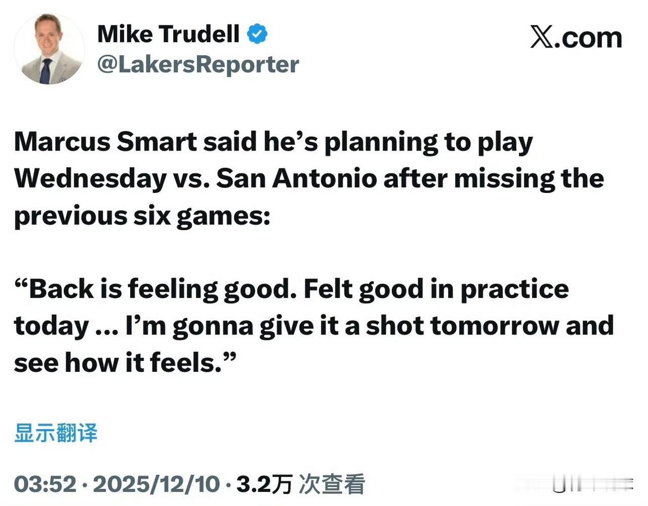 斯玛特原来是这样用的! 湖人队球员斯玛特终于要复出了,他计划出战明天对阵马刺队的比赛。斯玛特因背部痉挛缺席了过去的六场比赛,这难免让人感到疑惑和担忧,以为他伤势非常严重,但事实并非如此。斯玛特在接受媒体采访表示自己背部感觉良好,训练感觉也不错,休战是球队医疗团队和教练组的决定,目的是确保健康。 明天对阵马刺队是本赛季NBA杯的八强赛,晋级的球队每名球员和教练都能收获10万美金的奖金,这将是一场非常重要的比赛,所以湖人队选择让斯玛特在这场比赛中复出。或许这就是湖人队使用斯玛特的方式,常规赛让他打打停停休养,只出战一些关键、重要的场次,以保障其完全健康出战季后赛。斯玛特已经成为湖人队的重要轮换,能够带来很多积极的作用,他的健康太重要了!