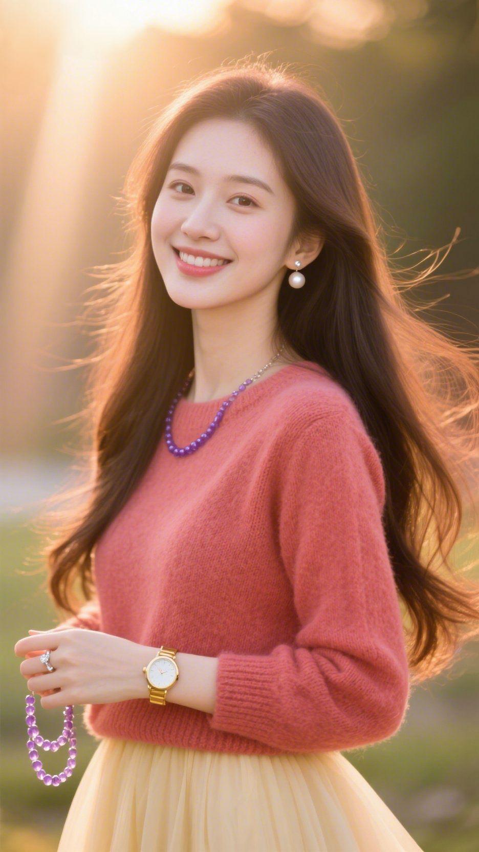 夕光柔 晚照的金缕漫过发梢,她毛衣的暖红,像把秋阳揉进了针脚。淡纱裙裾轻垂,衬得腕间的光泽,都浸着温软。 发梢随微风扬起的弧度,裹着夕色的柔——并非灼目的亮,更像刚沏好的温茶,暖得恰好。颈间的紫串轻悬,与耳侧的珠饰相衬,牵起一缕舒展,像把此刻的松弛,都收在了笑涡里。 没有刻意的修饰,只是自然舒展着,便成了夕光里最妥帖的画面:是暖衣裹着的平和,是风栖发梢的轻,是不经意间,漫开的温煦与柔。 夕光温软 暖衣轻帧