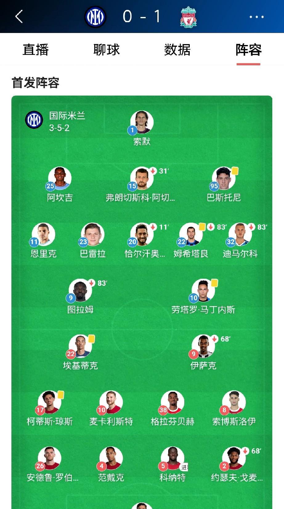 主场拿不下利物浦,基本宣布国米丧失了直接出线的机会。 目前的国米面对强队时还是缺少改变战局,一击致命的顶级球星。欧冠赛场的实力派对手相对意甲的争冠对手高一个档次,在意甲打那不勒斯,尤文和米兰起码是创造出了很多机会 只是终结能力差才输球。而欧冠无论是客场打马竞还是主场打利物浦,国米发挥也不能说差,但是绝对机会并不多,这还是实力问题。当然恰20第11分钟就受伤,阿切尔比第30分钟也伤退,让国米白白损失两次换人名额,导致后手不足,同时也看到,没有萨拉赫的利物浦的进攻和防守明显更专注,尤其下半场几乎没有留给国米什么机会。 这两场比赛国米在比赛最后阶段都因为自己的错误付出代价。打马竞补时最后时刻定位球盯防漏人被绝杀,打利物浦常规赛结束前无谓的犯规吃点输球,但这就是竞技体育,局势瞬息万变。就当为球队换血练兵,替齐沃交学费。输掉这两场比赛,国米直接前8出线的几率几乎化为乌有。因为接下来客场打多特,主场打阿森纳,比赛难度一点都不亚于这两场比赛,想拿4分概率低到个位数。比较现实点就是争取2分进入淘汰赛上半区,面对相对较弱的附加赛对手争取两回合取胜出线!
