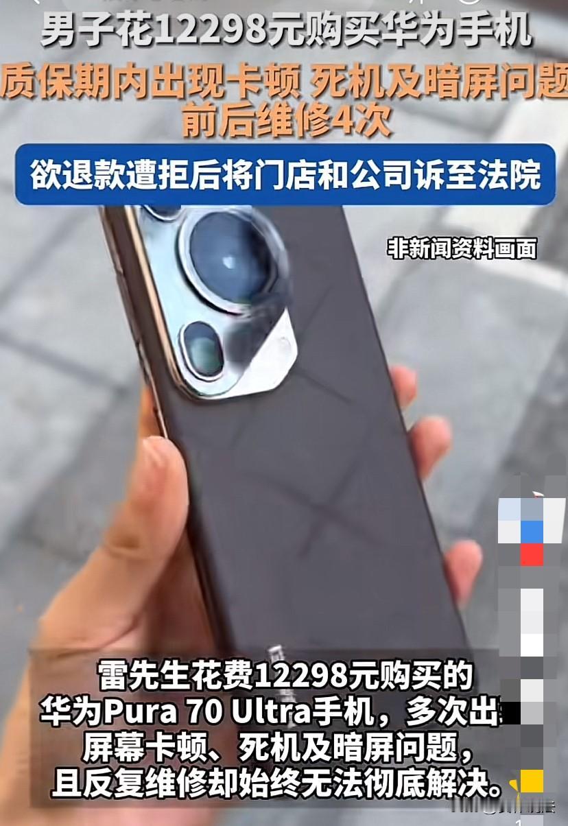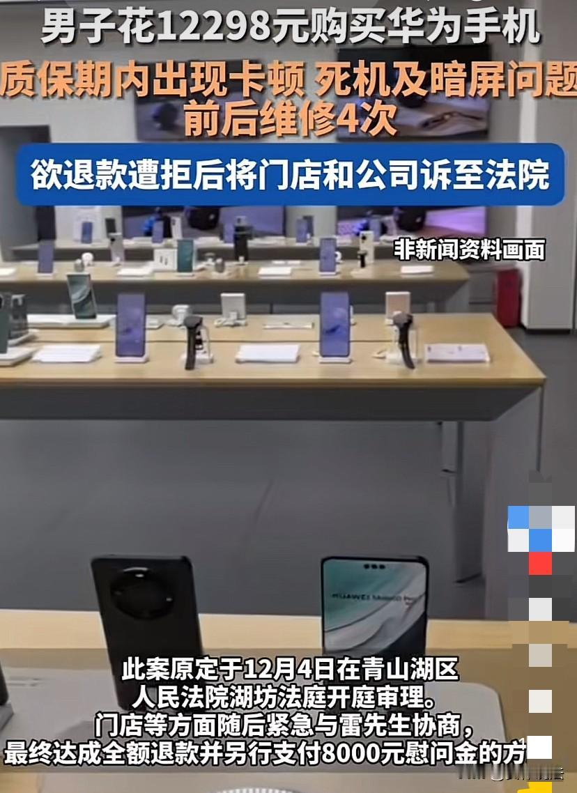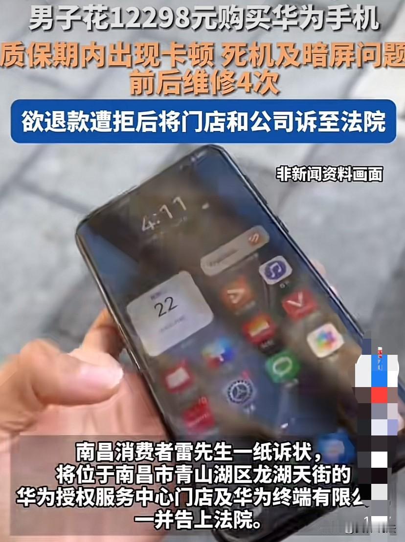 江西南昌,男子豪掷12298元买了一部华为手机,质保期2年,结果刚使用了1年,便出现卡顿、死机、暗屏多个问题,前后维修了4次,还是没彻底解决问题。男子对售后失去信心,因还在质保期内便要求退换机,遭拒后一怒之下将售后和厂家告上法庭,要求退还12298元购机款并赔偿1元精神损失费! 据悉,2024年4月19日,雷先生花12298元在一华为授权服务中心买了一部Pura 70 Ultra手机。结果刚使用了1年便出现卡顿、死机及暗屏问题。 由于手机的质保期是2年,还在质保期内,2025年4月20日,雷先生便将手机送到授权服务中心维修。 授权服务中心的维修人员检测后说是主板故障,需等待材料更换。 次日,维修人员通知雷先生取机。雷先生看到“终端服务报告(服务报告)”显示,此次维修方式为“参数调整、保养”,回家后发现原来的问题并未彻底解决,同时手机后壳也出现密封不严情况。 4月25日,雷先生再次将手机送到授权服务中心。而这次,对方表示“后盖密封处理”问题需返厂维修。 雷先生同意返厂维修,但是要求对方彻底修复手机存在的问题。 4月27日,授权服务中心电话告知雷先生,手机死机的问题已经解决,将返厂处理后盖密封问题。 5天后,授权服务中心再次通知雷先生取机,可令雷先生万万没想到的是,现场就发现手机的死机、暗屏等问题依然没有解决,同时微信数据也无法传输了! 随后,维修人员随即将手机再次拿回维修间检修,至今未能修复。 到此,雷先生彻底失去耐心,也对授权服务中心已失去信心,便要求授权服务中心给自己退还手机。 雷先生能不能要求授权服务中心给自己退还手机? 《消费权益保护法》第23条规定,经营者应当保证在正常使用商品或者接受服务的情况下其提供的商品或者服务应当具有的质量、性能、用途和有效期限。…… 第24条规定,经营者提供的商品或者服务不符合质量要求的,消费者可以依照国家规定、当事人约定退货,或者要求经营者履行更换、修理等义务。…… 《移动电话机商品修理更换退货责任规定》第13条更是明确规定,在三包有效期内,移动电话机主机出现屏幕无显示、无法开机、不能正常登录等主机故障,经两次修理,仍不能正常使用的,凭三包凭证中修理者提供的修理记录,由销售者负责为消费者免费更换同型号同规格的移动电话机主机。 雷先生的手机尚在质保期内,且因卡顿、死机、暗屏等主板问题,一连维修4次也没有修好,很显然符合退换机的要求。 可令雷先生没想到的是,当其向授权服务中心提出退换机的要求后,授权服务中心却表示雷先生所经历的4次服务,都属于“检修”而不是“维修!” 雷先生懵了,与授权服务中心沟通未果,认为授权服务中心是强词夺理,意图推卸责任,于是一纸诉状将授权服务中心还有厂家告上法庭,要求退还12298元购机款并赔偿1元精神损失费! 而最终,法院立案并确定开庭时间不久,华为方面主动联系到雷先生寻求和解,表示可以给雷先生更换一款即将上市的新款手机。 不过,雷先生不愿意。 最终,经过协商,华为方面向雷先生全额退还此前购机款12298元,并支付8000元慰问金。雷先生随后办理了撤诉。 最后,斥资过万购买高端手机,图的是稳定性能与优质体验,可手机在保修期内频繁“罢工”,反复送修耗费时间精力不说,商家还“店大欺客!”、雷先生的维权经历,无疑是戳中了不少消费者面对产品质量问题时的痛点! 其最终没有“自认倒霉”,而是选择拿起法律武器硬刚商家,不仅为自己讨回公道,更给所有消费者上了一堂生动的法律课!值得点赞! 这事您怎么看?欢迎在评论区留言,与大家一起交流您的看法! ------ 关注@安律说法 案例中看人生百态,法律中寻破局之法!
