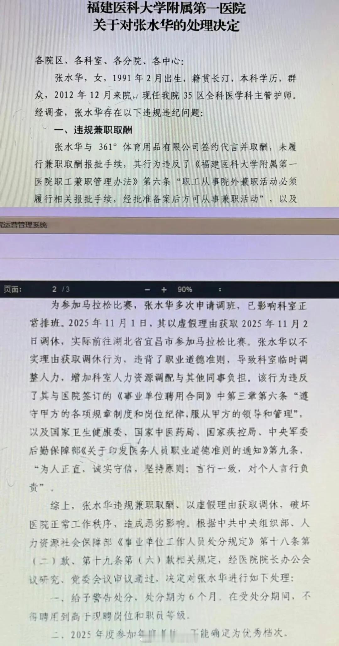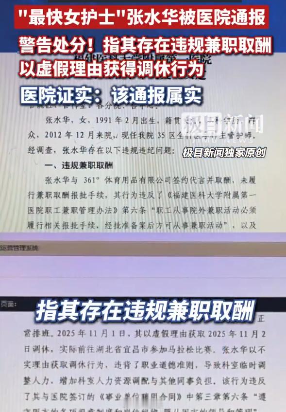 最快女护士张水华被医院处分,指其在存违规兼职取酬、以虚假理由获得调休,被医院警告处分6个月,并且不能参与2025年评优。医生是事业编,查了下《事业单位工作人员处分规定》,的确,第十九条第六款规定:(六)违反国家规定,从事、参与营利性活动或者兼任职务领取报酬的;给予警告或者记过处分;情节较重的,给予降低岗位等级处分;情节严重的,给予开除处分:最快女护士张水华被医院处分最快女护士张水华被医院处分医院回应张水华被警告处分